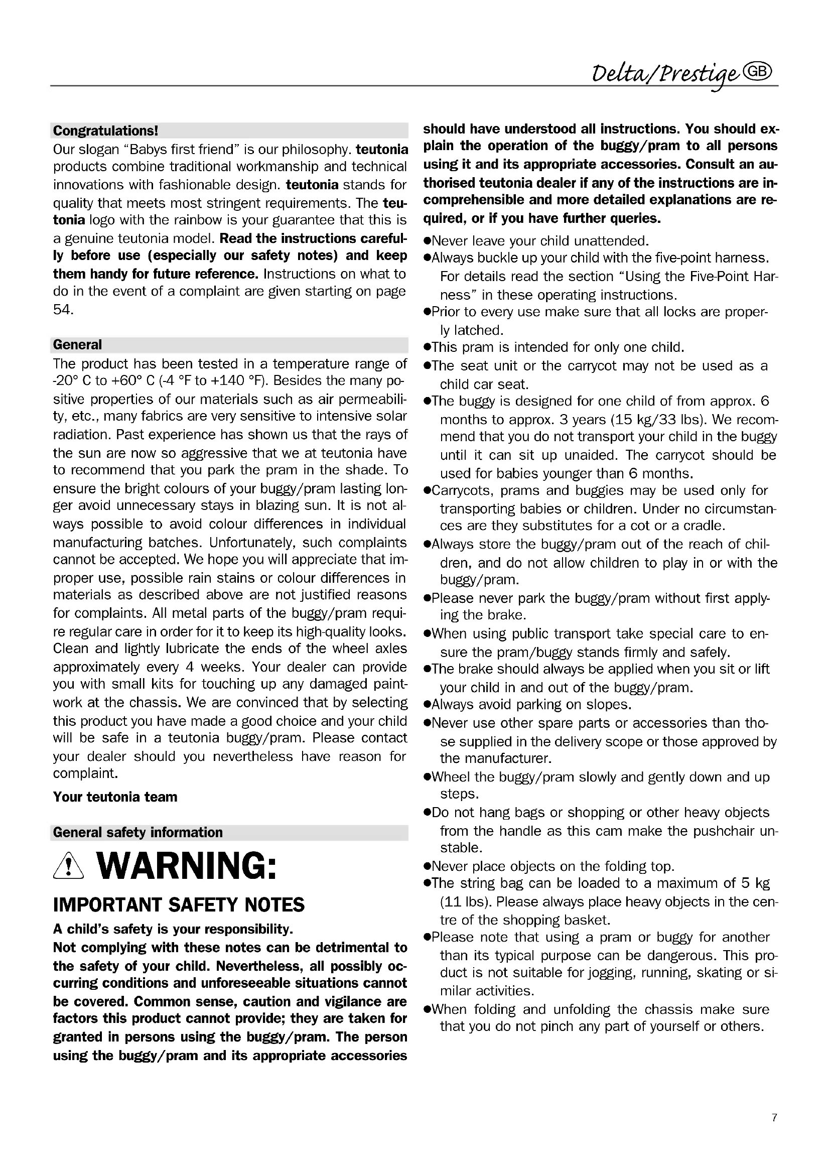 A child’s safety is your responsibility. Not complying with these notes can be detrimental to the safety of your child. Nevertheless, all possibly oc- curring conditions and unforeseeable situations cannot be covered. Common sense, caution and vigilance are factors this product cannot provide; they are taken for granted in persons using the buggy/pram. The person using the buggy/pram and its appropriate accessories should have understood all instructions. You should ex- plain the operation of the buggy/pram to all persons using it and its appropriate accessories. Consult an au- thorised teutonia dealer if any of the instructions are in- comprehensible and more detailed explanations are re- quired, or if you have further queries. ● Never leave your child unattended. ● Always buckle up your child with the five-point harness. For details read the section “Using the Five-Point Har- ness” in these operating instructions. ● Prior to every use make sure that all locks are proper- ly latched. ● This pram is intended for only one child. ● The seat unit or the carrycot may not be used as a child car seat. ● The buggy is designed for one child of from approx. 6 months to approx. 3 years (15 kg/33 lbs). We recom- mend that you do not transport your child in the buggy until it can sit up unaided. The carrycot should be used for babies younger than 6 months. ● Carrycots, prams and buggies may be used only for transporting babies or children. Under no circumstan- ces are they substitutes for a cot or a cradle. ● Always store the buggy/pram out of the reach of chil- dren, and do not allow children to play in or with the buggy/pram. ● Please never park the buggy/pram without first apply- ing the brake. ● When using public transport take special care to en- sure the pram/buggy stands firmly and safely. ● The brake should always be applied when you sit or lift your child in and out of the buggy/pram. ● Always avoid parking on slopes. ● Never use other spare parts or accessories than tho- se supplied in the delivery scope or those approved by the manufacturer. ● Wheel the buggy/pram slowly and gently down and up steps. ● Do not hang bags or shopping or other heavy objects from the handle as this cam make the pushchair un- stable. ● Never place objects on the folding top. ● The string bag can be loaded to a maximum of 5 kg (11 lbs). Please always place heavy objects in the cen- tre of the shopping basket. ● Please note that using a pram or buggy for another than its typical purpose can be dangerous. This pro- duct is not suitable for jogging, running, skating or si- milar activities. ● When folding and unfolding the chassis make sure that you do not pinch any part of yourself or others.