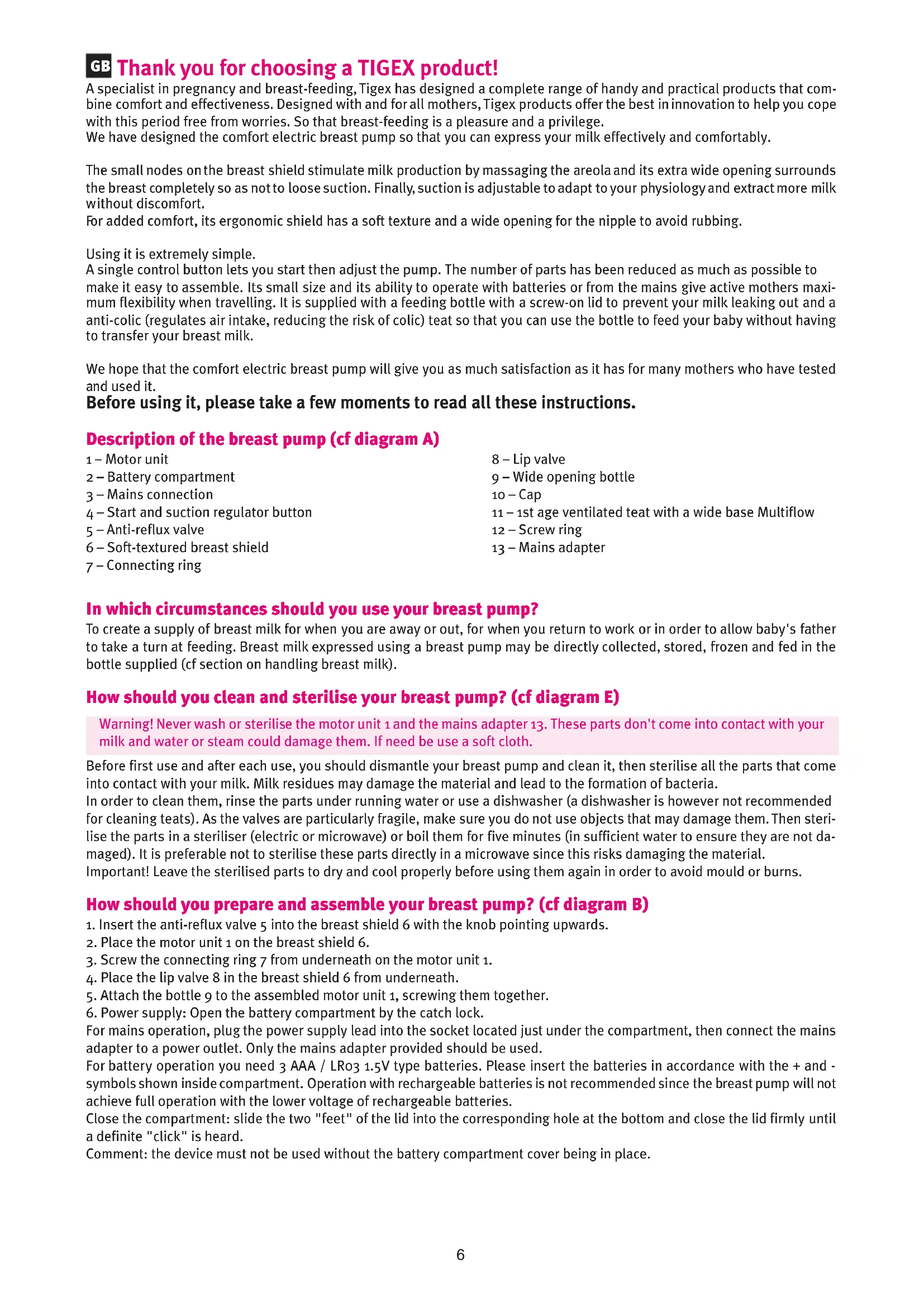 For mains operation, plug the power supply lead into the socket located just under the compartment, then connect the mains adapter to a power outlet. Only the mains adapter provided should be used. For battery operation you need 3 AAA / LR03 1.5V type batteries. Please insert the batteries in accordance with the + and - symbols shown inside compartment. Operation with rechargeable batteries is not recommended since the breast pump will not achieve full operation with the lower voltage of rechargeable batteries. Close the compartment: slide the two "feet" of the lid into the corresponding hole at the bottom and close the lid firmly until a definite "click" is heard. Comment: the device must not be used without the battery compartment cover being in place. Thank you for choosing a TIGEX product! A specialist in pregnancy and breast-feeding, Tigex has designed a complete range of handy and practical products that com- bine comfort and effectiveness. Designed with and for all mothers, Tigex products offer the best in innovation to help you cope with this period free from worries. So that breast-feeding is a pleasure and a privilege. We have designed the comfort electric breast pump so that you can express your milk effectively and comfortably.