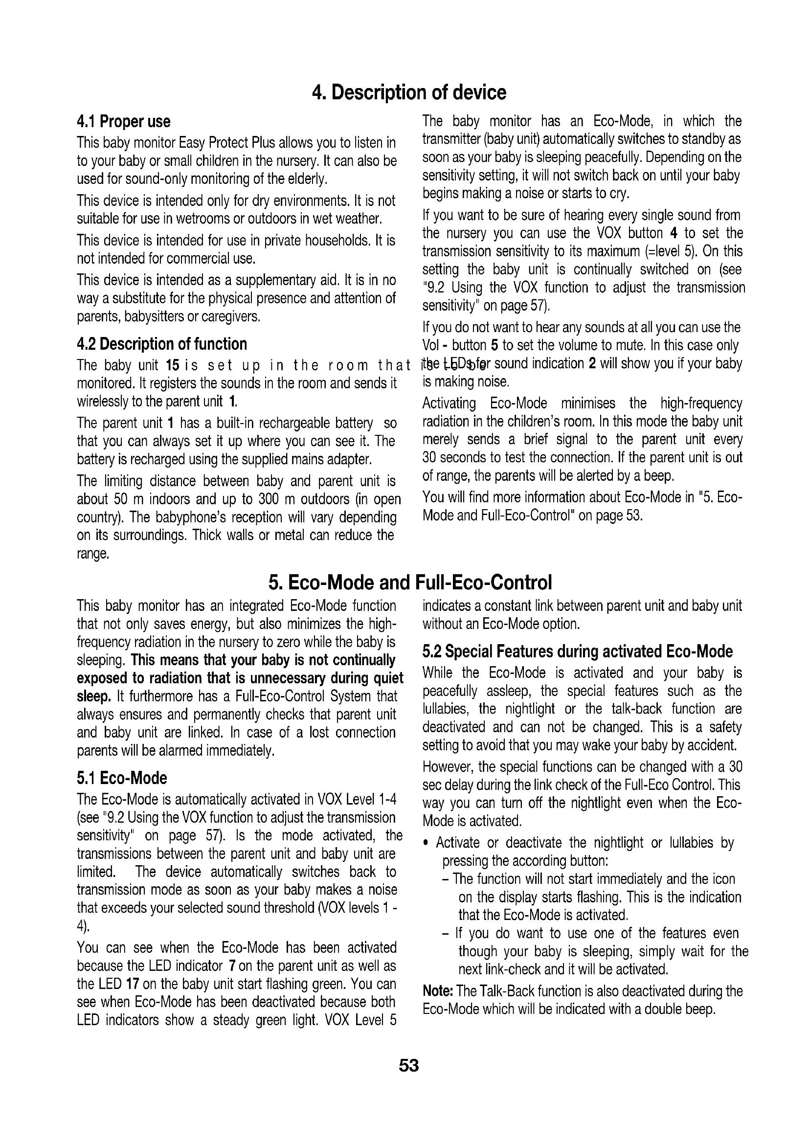 will show you if your baby is making noise. Activating Eco-Mode minimises the high-frequency radiation in the children’s room. In this mode the baby unit merely sends a brief signal to the parent unit every 30 seconds to test the connection. If the parent unit is out of range, the parents will be alerted by a beep. You will find more information about Eco-Mode in "5.Eco- Mode and Full-Eco-Control" on page 53.