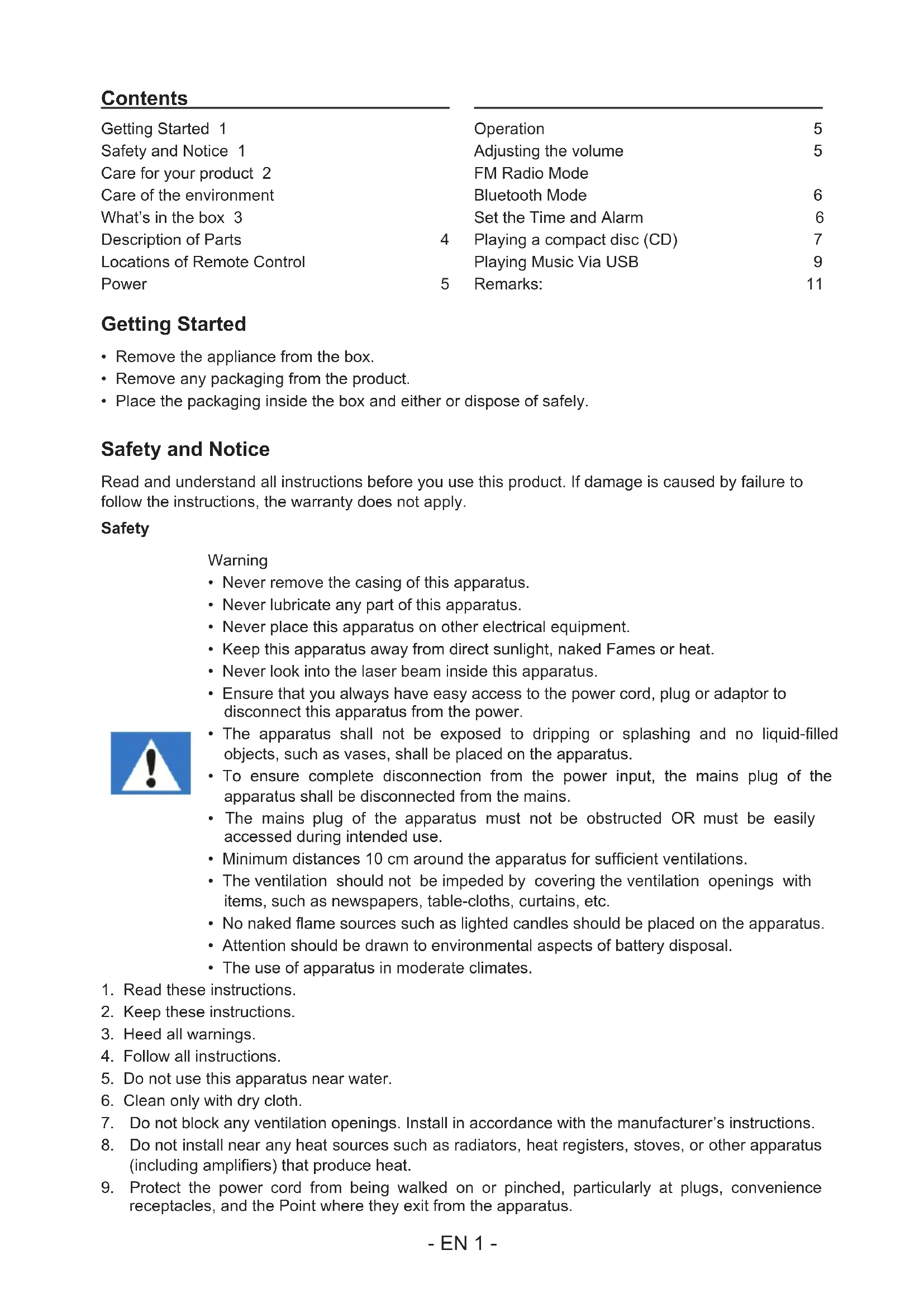 receptacles, and the Point where they exit from the apparatus. Getting Started 1 Safety and Notice 1 Care for your product 2 Care of the environment 2 What’s in the box 3 Description of Parts 4 Locations of Remote Control 4 Power 5 Operation 5 Adjusting the volume 5 FM Radio Mode 5 Bluetooth Mode 6 Set the Time and Alarm 6 Playing a compact disc (CD) 7 Playing Music Via USB 9 Remarks: 11 Contents- EN 2 -