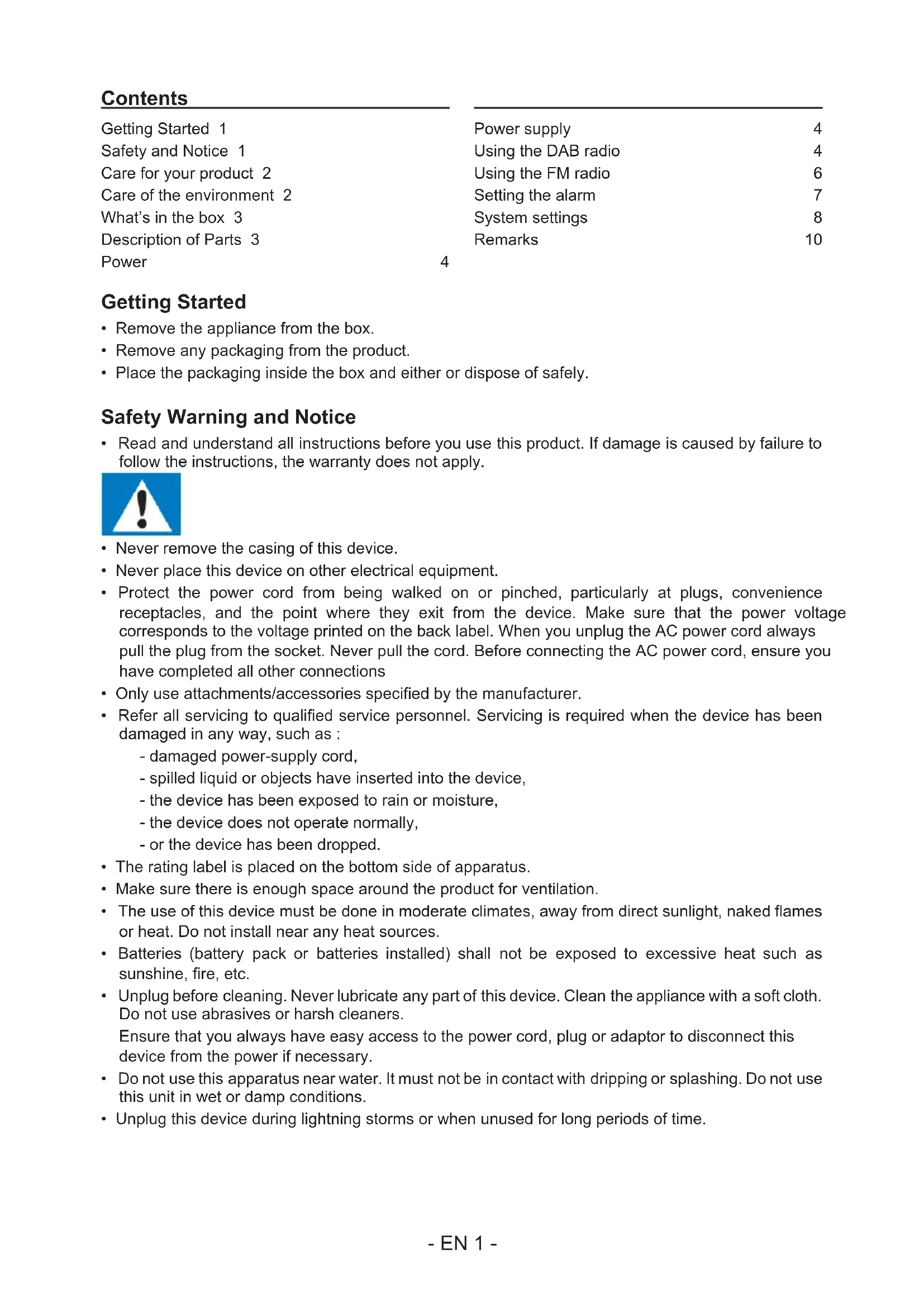 - Unplug this device during lightning storms or when unused for long periods of time. Getting Started 1 Safety and Notice 1 Care for your product 2 Care of the environment 2 What’s in the box 3 Description of Parts 3 Power 4 Power supply 4 Using the DAB radio 4 Using the FM radio 6 Setting the alarm 7 System settings 8 Remarks: 10