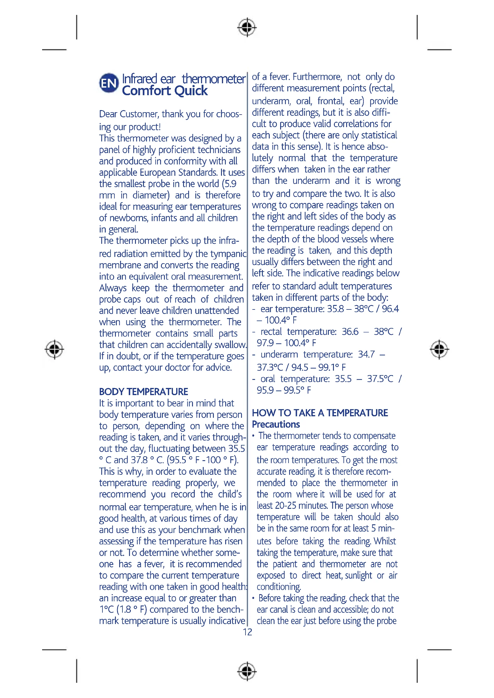 Infrared ear thermometer Comfort Quick Dear Customer, thank you for choos- ing our product! This thermometer was designed by a panel of highly proficient technicians and produced in conformity with all applicable European Standards. It uses the smallest probe in the world (5.9 mm in diameter) and is therefore ideal for measuring ear temperatures of newborns, infants and all children in general. The thermometer picks up the infra- red radiation emitted by the tympanic membrane and converts the reading into an equivalent oral measurement. Always keep the thermometer and probe caps out of reach of children and never leave children unattended when using the thermometer. The thermometer contains small parts that children can accidentally swallow. If in doubt, or if the temperature goes up, contact your doctor for advice. BODY TEMPERATURE It is important to bear in mind that body temperature varies from person to person, depending on where the reading is taken, and it varies through- out the day, fluctuating between 35.5 ° C and 37.8 ° C. (95.5 ° F -100 ° F). This is why, in order to evaluate the temperature reading properly, we recommend you record the child’s normal ear temperature, when he is in good health, at various times of day and use this as your benchmark when assessing if the temperature has risen or not. To determine whether some- one has a fever, it is recommended to compare the current temperature reading with one taken in good health: an increase equal to or greater than 1°C (1.8 ° F) compared to the bench- mark temperature is usually indicative of a fever. Furthermore, not only do different measurement points (rectal, underarm, oral, frontal, ear) provide different readings, but it is also diffi- cult to produce valid correlations for each subject (there are only statistical data in this sense). It is hence abso- lutely normal that the temperature differs when taken in the ear rather than the underarm and it is wrong to try and compare the two. It is also wrong to compare readings taken on the right and left sides of the body as the temperature readings depend on the depth of the blood vessels where the reading is taken, and this depth usually differs between the right and left side. The indicative readings below refer to standard adult temperatures taken in different parts of the body: - ear temperature: 35.8 – 38°C / 96.4 – 100.4° F - rectal temperature: 36.6 – 38°C /