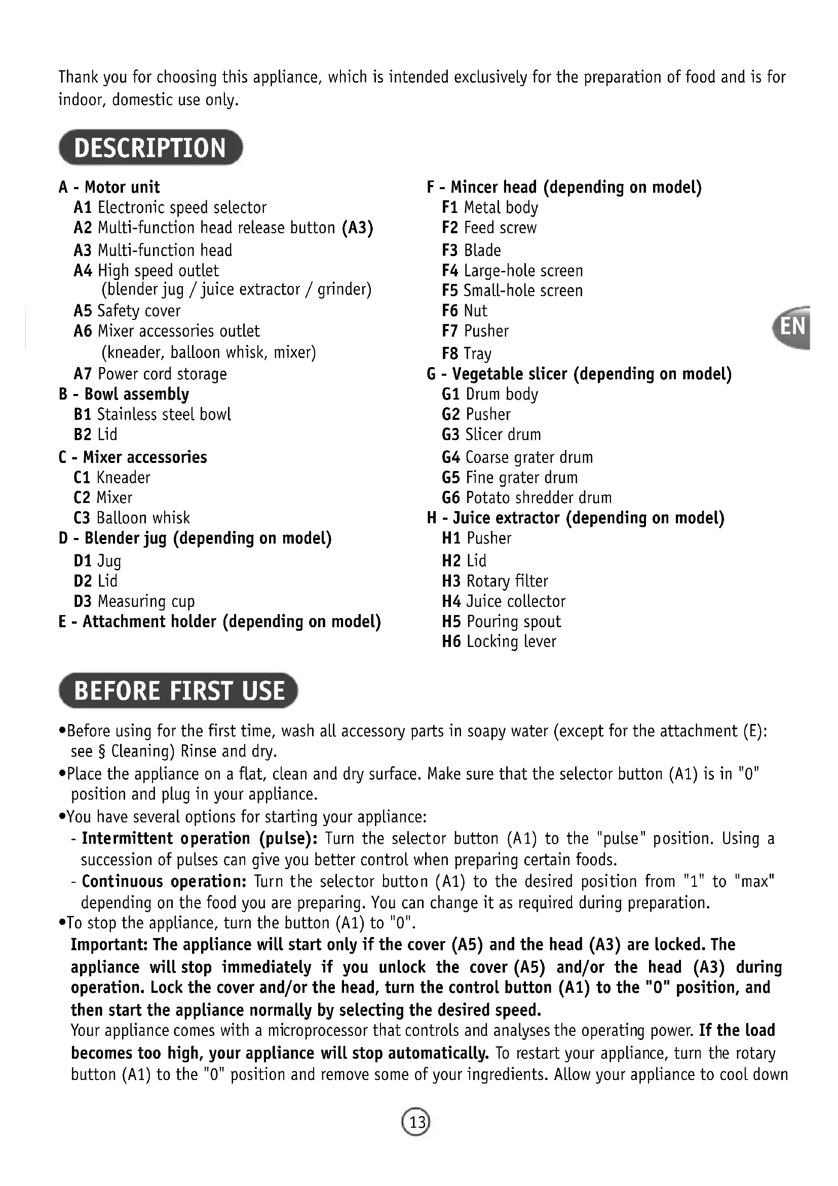 - To stop the appliance, turn the button (A1) to "0". Important: The appliance will start only if the cover (A5) and the head (A3) are locked. The appliance will stop immediately if you unlock the cover (A5) and/or the head (A3) during operation. Lock the cover and/or the head, turn the control button (A1) to the "0" position, and then start the appliance normally by selecting the desired speed. Your appliance comes with a microprocessor that controls and analyses the operating power. If the load becomes too high, your appliance will stop automatically. To restart your appliance, turn the rotary button (A1) to the "0" position and remove some of your ingredients. Allow your appliance to cool down Thank you for choosing this appliance, which is intended exclusively for the preparation of food and is for indoor, domestic use only.