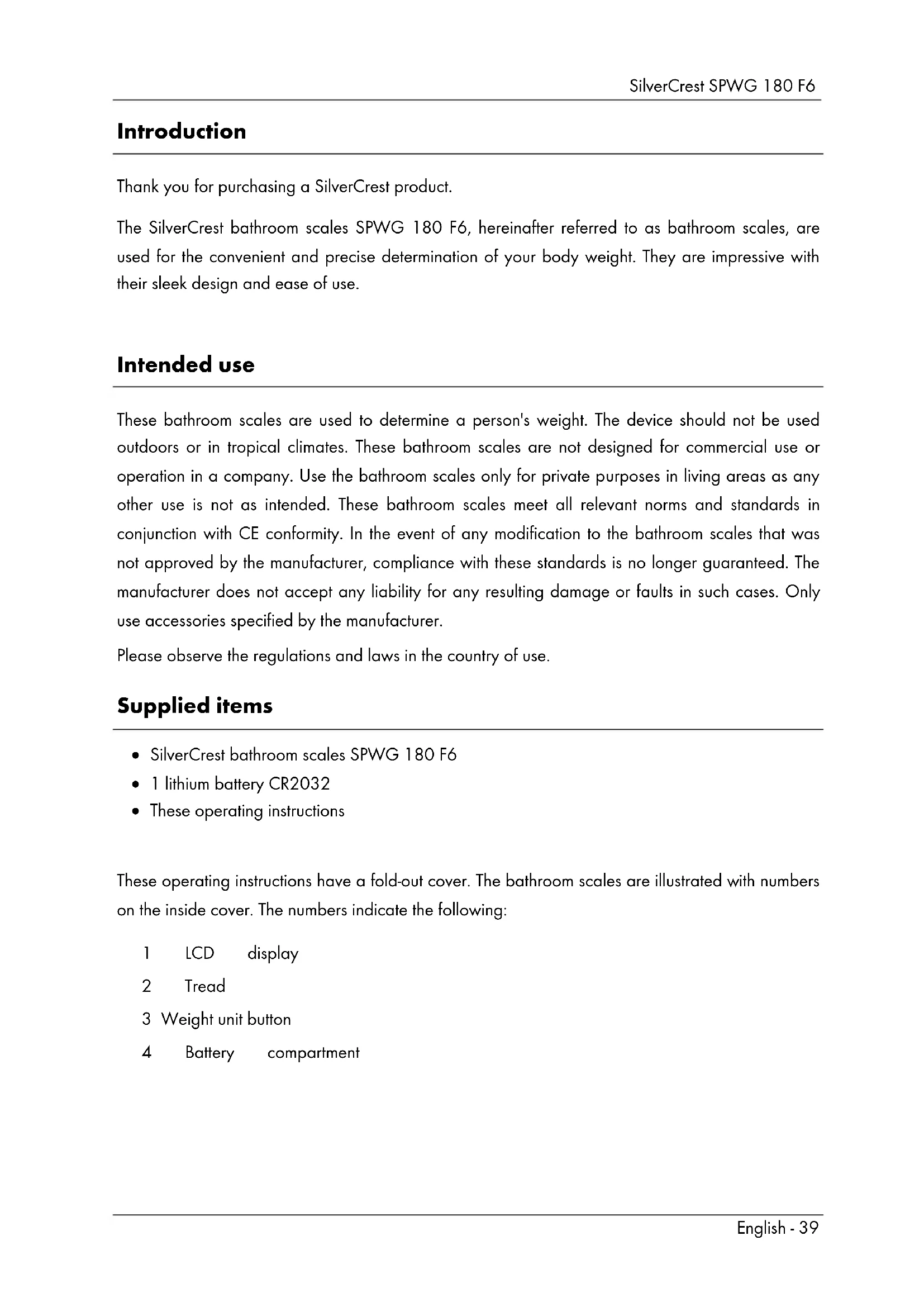 Technical data Operating voltage: 3V Battery: 1 x 3V lithium battery CR2032 Battery run time: approx. 5 years (if used daily for 60 seconds) Units of weight: kg / lb / st (adjustable) Maximum weight: max. 180kg / 396lb Graduation: 0.1kg / 0.2lb Measuring tolerance: +/- (1% +0.1kg / 0.2lb) for 30kg to 180kg Auto Power Off function: approx. 10 seconds Dimensions (W x D x H): 330 x 290 x 19mm Weight: approx. 1,7kg Operating temperature: +10°C to +40°C The technical data and design may be changed without notification. Safety instructions Before using the bathroom scales for the first time, read the following instructions carefully and pay attention to all warnings, even if you are familiar with handling electronic devices. Store these operating instructions in a safe place for future reference. If you sell the bathroom scales or pass them on, always include these instructions. WARNING! This symbol indicates important information for safe operation of the bathroom scales and the safety of the user. This symbol indicates that one must not step on the bathroom scales with wet or damp feet. The same applies if the tread is wet or damp. You could slip and injure yourself.SilverCrest SPWG 180 F6 English - 41