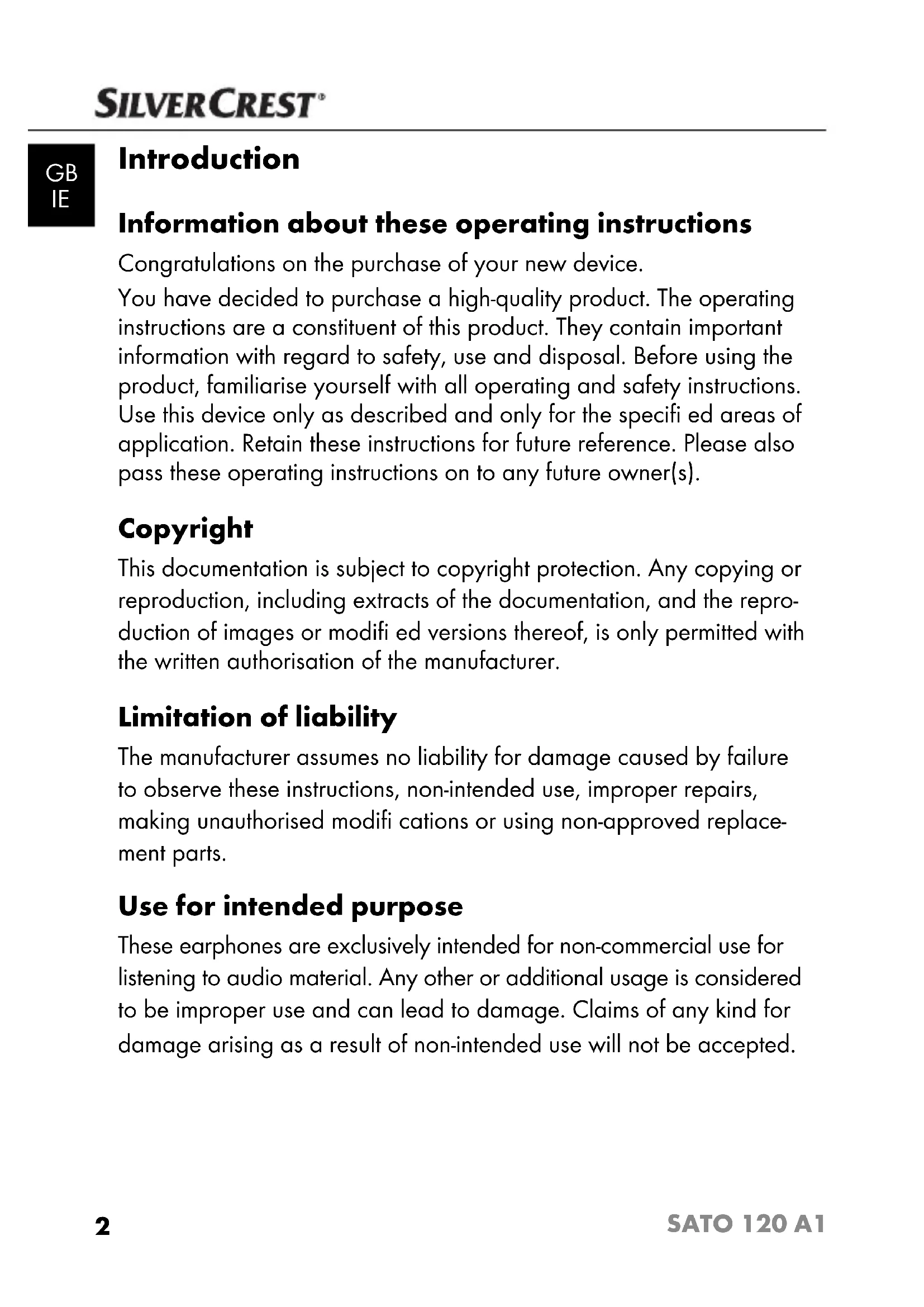 SATO 120 A1 Introduction Information about these operating instructions Congratulations on the purchase of your new device. You have decided to purchase a high-quality product. The operating instructions are a constituent of this product. They contain important information with regard to safety, use and disposal. Before using the product, familiarise yourself with all operating and safety instructions. Use this device only as described and only for the specifi ed areas of application. Retain these instructions for future reference. Please also pass these operating instructions on to any future owner(s). Copyright This documentation is subject to copyright protection. Any copying or reproduction, including extracts of the documentation, and the repro- duction of images or modifi ed versions thereof, is only permitted with the written authorisation of the manufacturer. Limitation of liability The manufacturer assumes no liability for damage caused by failure to observe these instructions, non-intended use, improper repairs, making unauthorised modifi cations or using non-approved replace- ment parts. Use for intended purpose These earphones are exclusively intended for non-commercial use for listening to audio material. Any other or additional usage is considered to be improper use and can lead to damage. Claims of any kind for damage arising as a result of non-intended use will not be accepted. IB_42782_SATO120A1_LB3.indb 2IB_42782_SATO120A1_LB3.indb 2 09.10.13 11:1709.10.13 11:173 SATO 120 A1