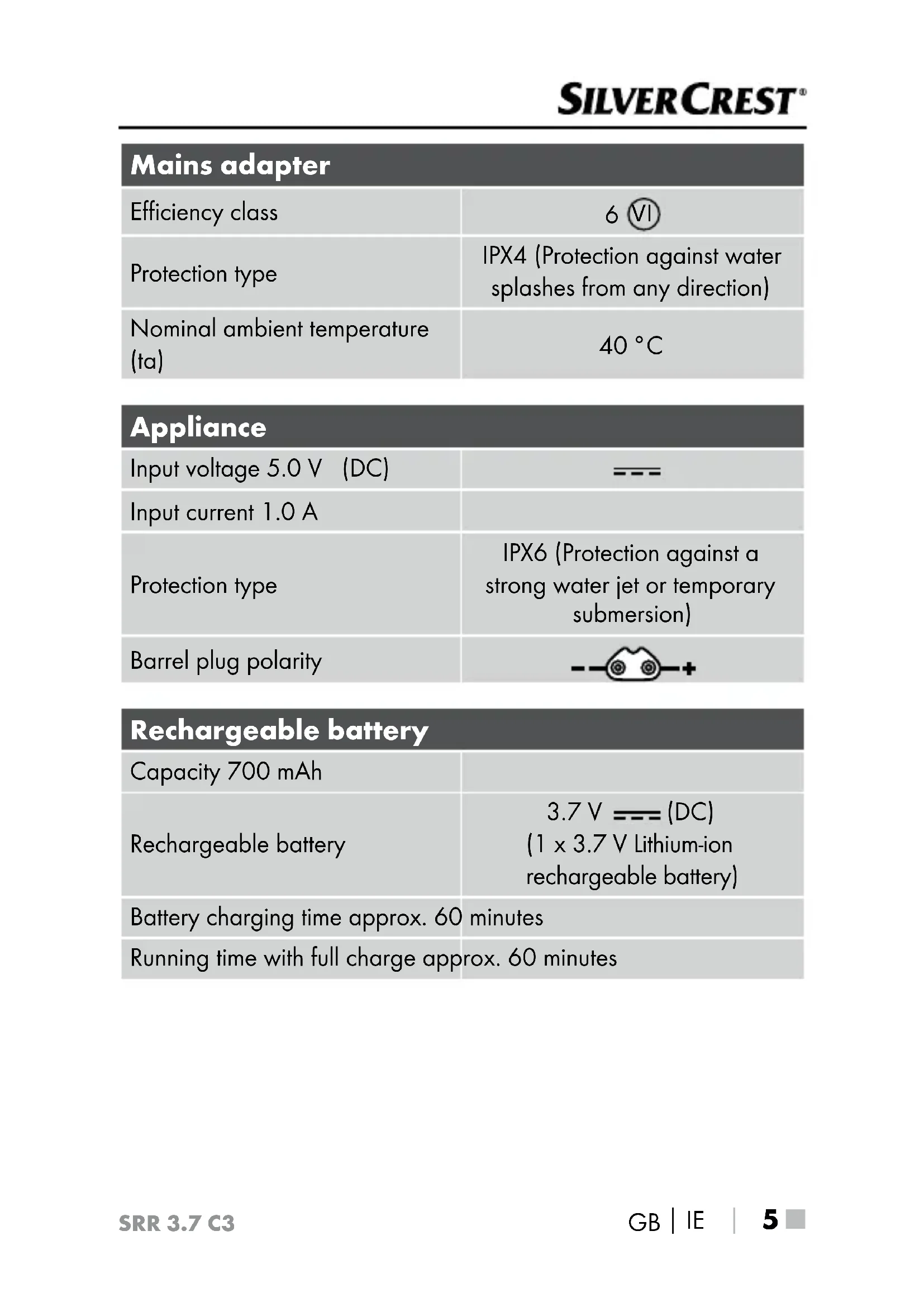 Protection type IPX4 (Protection against water splashes from any direction) Nominal ambient temperature (ta) 40 °C Appliance Input voltage 5.0 V (DC) Input current 1.0 A Protection type IPX6 (Protection against a strong water jet or temporary submersion) Barrel plug polarity Rechargeable battery Capacity 700 mAh Rechargeable battery
