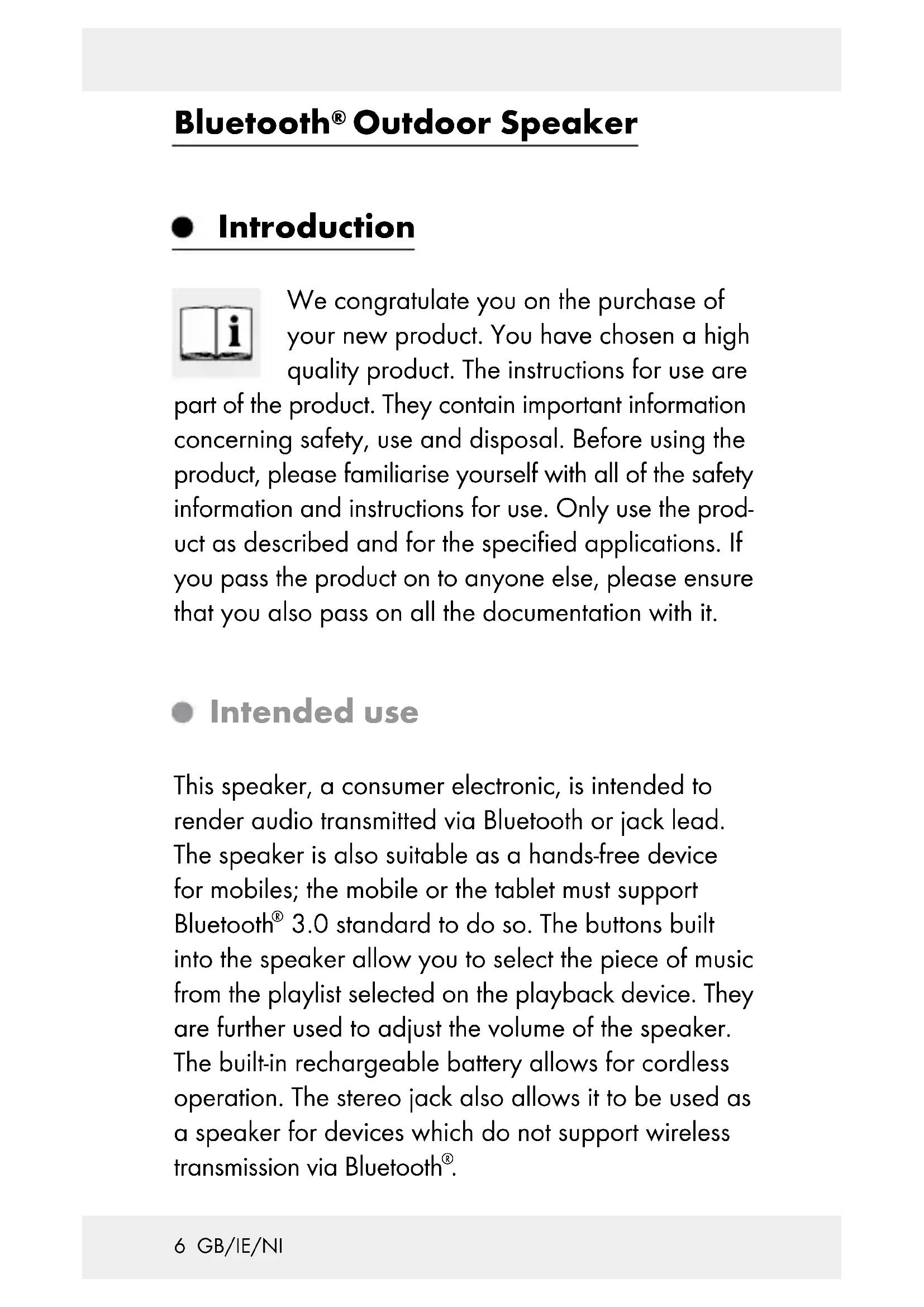 Outdoor Speaker Introduction We congratulate you on the purchase of your new product. You have chosen a high quality product. The instructions for use are part of the product. They contain important information concerning safety, use and disposal. Before using the product, please familiarise yourself with all of the safety information and instructions for use. Only use the prod- uct as described and for the specified applications. If you pass the product on to anyone else, please ensure that you also pass on all the documentation with it. Intended use This speaker, a consumer electronic, is intended to render audio transmitted via Bluetooth or jack lead. The speaker is also suitable as a hands-free device for mobiles; the mobile or the tablet must support Bluetooth