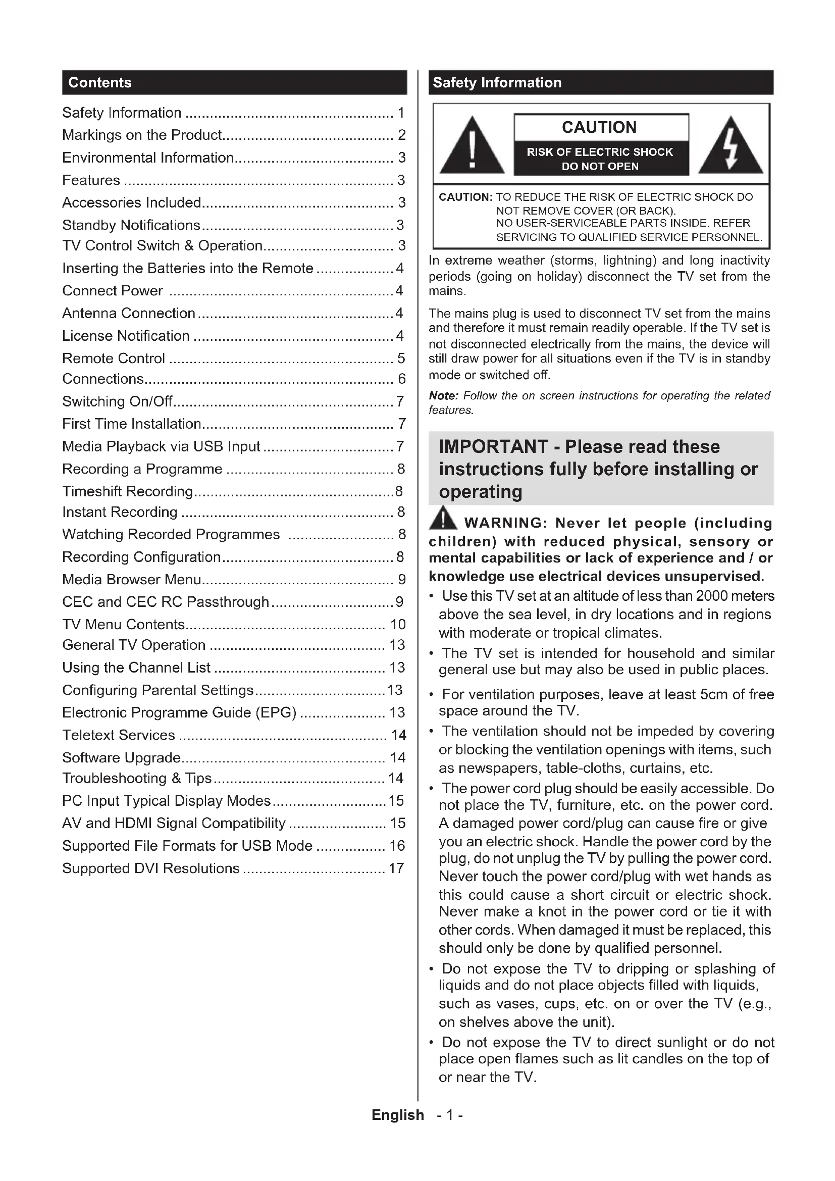 - Do not expose the TV to direct sunlight or do not place open ames such as lit candles on the top of or near the TV. Contents Safety Information ................................................... 1 Markings on the Product.......................................... 2 Environmental Information....................................... 3 Features .................................................................. 3 Accessories Included............................................... 3 Standby Notications ............................................... 3 TV Control Switch & Operation................................ 3 Inserting the Batteries into the Remote ................... 4 Connect Power ....................................................... 4 Antenna Connection ................................................ 4 License Notication ................................................. 4 Remote Control ....................................................... 5 Connections............................................................. 6 Switching On/O ...................................................... 7 First Time Installation............................................... 7 Media Playback via USB Input ................................ 7 Recording a Programme ......................................... 8 Timeshift Recording ................................................. 8 Instant Recording .................................................... 8 Watching Recorded Programmes .......................... 8 Recording Conguration .......................................... 8 Media Browser Menu............................................... 9 CEC and CEC RC Passthrough .............................. 9 TV Menu Contents................................................. 10 General TV Operation ........................................... 13 Using the Channel List .......................................... 13 Conguring Parental Settings ................................ 13 Electronic Programme Guide (EPG) ..................... 13 Teletext Services ................................................... 14 Software Upgrade.................................................. 14 Troubleshooting & Tips .......................................... 14 PC Input Typical Display Modes ............................ 15 AV and HDMI Signal Compatibility ........................ 15 Supported File Formats for USB Mode ................. 16 Supported DVI Resolutions ................................... 17English - 2 -