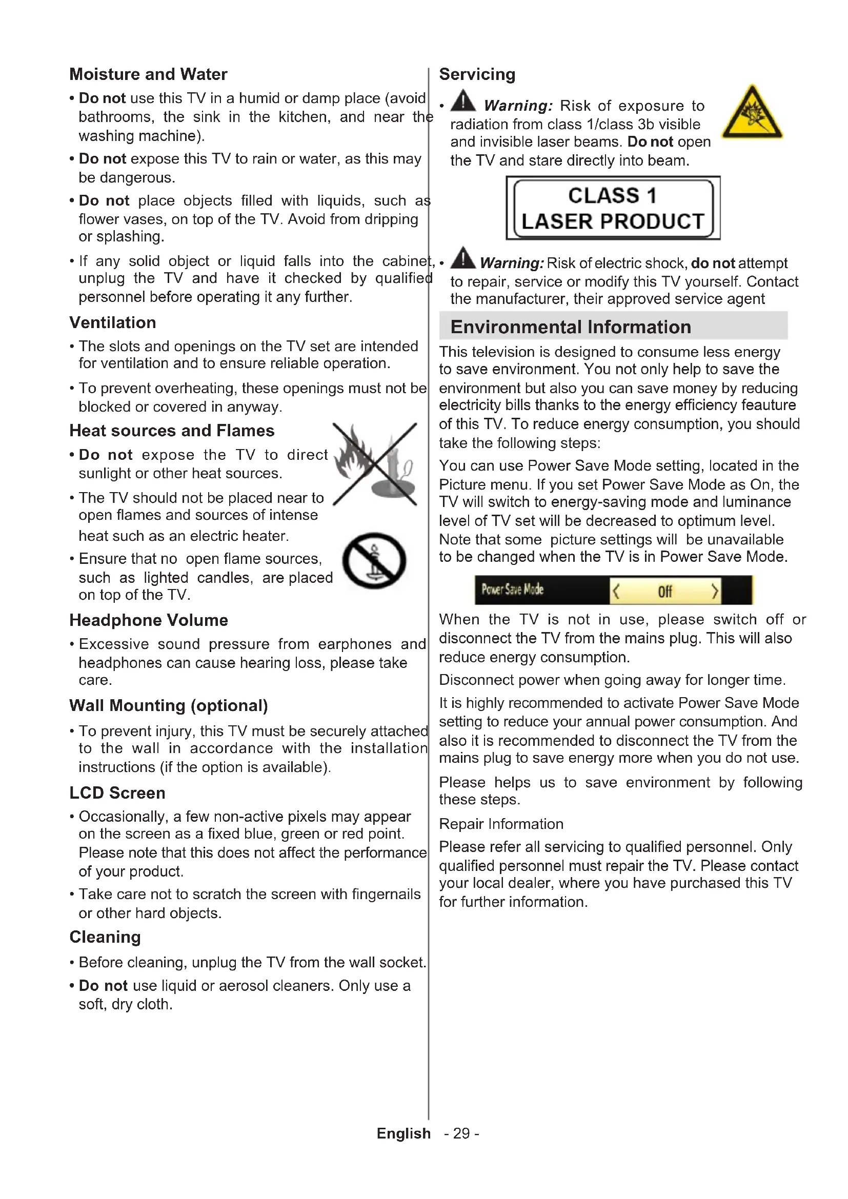 - Warning: Risk of electric shock, do not attempt to repair, service or modify this TV yourself. Contact the manufacturer, their approved service agent Environmental Information This television is designed to consume less energy to save environment. You not only help to save the environment but also you can save money by reducing electricity bills thanks to the energy efciency feauture of this TV. To reduce energy consumption, you should take the following steps: You can use Power Save Mode setting, located in the Picture menu. If you set Power Save Mode as On, the TV will switch to energy-saving mode and luminance level of TV set will be decreased to optimum level. Note that some picture settings will be unavailable to be changed when the TV is in Power Save Mode. When the TV is not in use, please switch off or disconnect the TV from the mains plug. This will also reduce energy consumption. Disconnect power when going away for longer time. It is highly recommended to activate Power Save Mode setting to reduce your annual power consumption. And also it is recommended to disconnect the TV from the mains plug to save energy more when you do not use. Please helps us to save environment by following these steps. Repair Information Please refer all servicing to qualied personnel. Only qualied personnel must repair the TV. Please contact your local dealer, where you have purchased this TV for further information.English - 30 - Accessories included