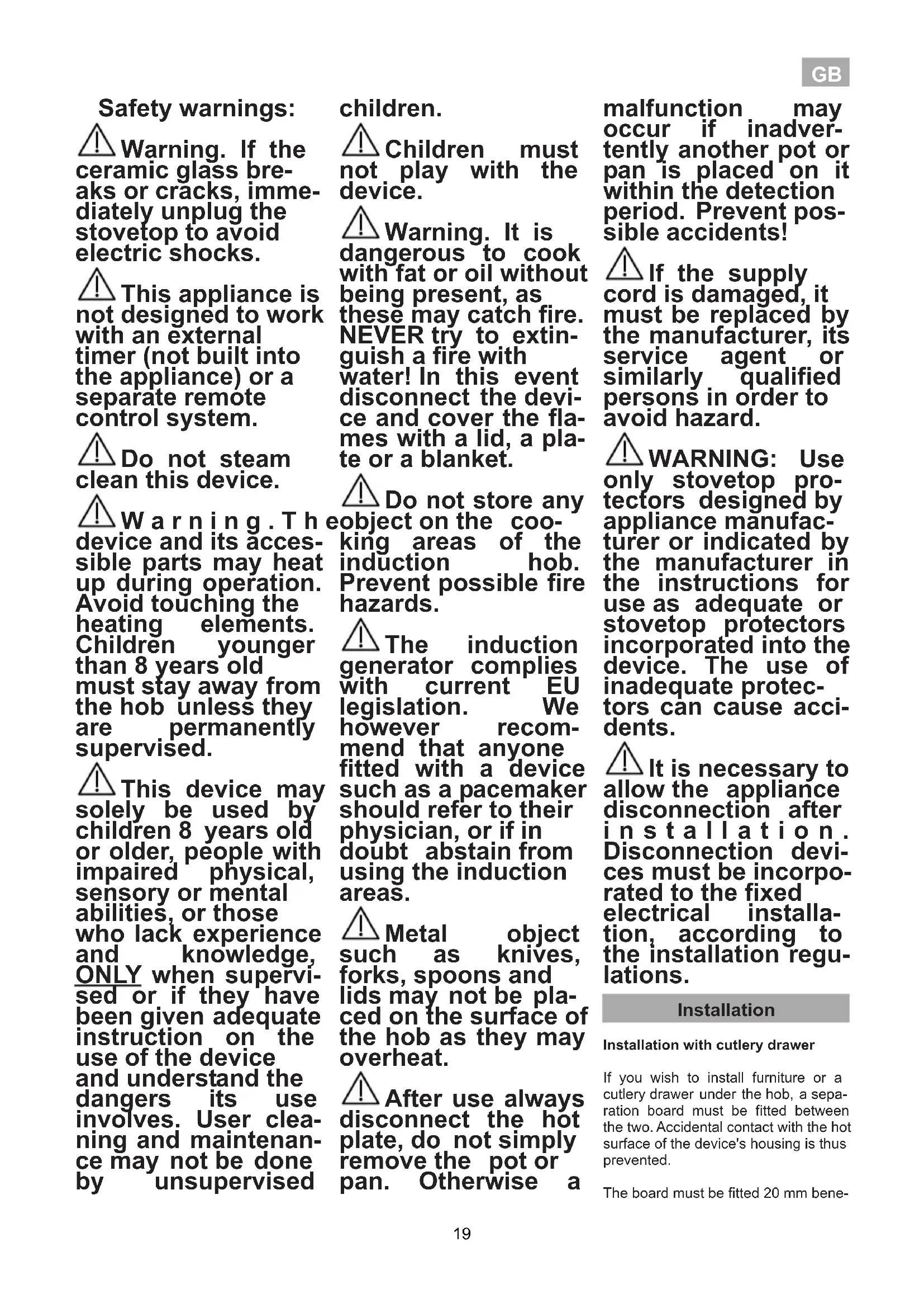 18GB Safety warnings: Warning. If the ceramic glass bre- aks or cracks, imme- diately unplug the stovetop to avoid electric shocks. This appliance is not designed to work with an external timer (not built into the appliance) or a separate remote control system. Do not steam clean this device. W a r n i n g . T h e device and its acces- sible parts may heat up during operation. Avoid touching the heating elements. Children younger than 8 years old must stay away from the hob unless they are permanently supervised. This device may solely be used by children 8 years old or older, people with impaired physical, sensory or mental abilities, or those who lack experience and knowledge, ONLY when supervi- sed or if they have been given adequate instruction on the use of the device and understand the dangers its use involves. User clea- ning and maintenan- ce may not be done by unsupervised children. Children must not play with the device. Warning. It is dangerous to cook with fat or oil without being present, as these may catch fire. NEVER try to extin- guish a fire with water! In this event disconnect the devi- ce and cover the fla- mes with a lid, a pla- te or a blanket. Do not store any object on the coo- king areas of the induction hob. Prevent possible fire hazards. The induction generator complies with current EU legislation. We however recom- mend that anyone fitted with a device such as a pacemaker should refer to their physician, or if in doubt abstain from using the induction areas. Metal object such as knives, forks, spoons and lids may not be pla- ced on the surface of the hob as they may overheat. After use always disconnect the hot plate, do not simply remove the pot or pan. Otherwise a malfunction may occur if inadver- tently another pot or pan is placed on it within the detection period. Prevent pos- sible accidents! If the supply cord is damaged, it must be replaced by the manufacturer, its service agent or similarly qualified persons in order to avoid hazard.