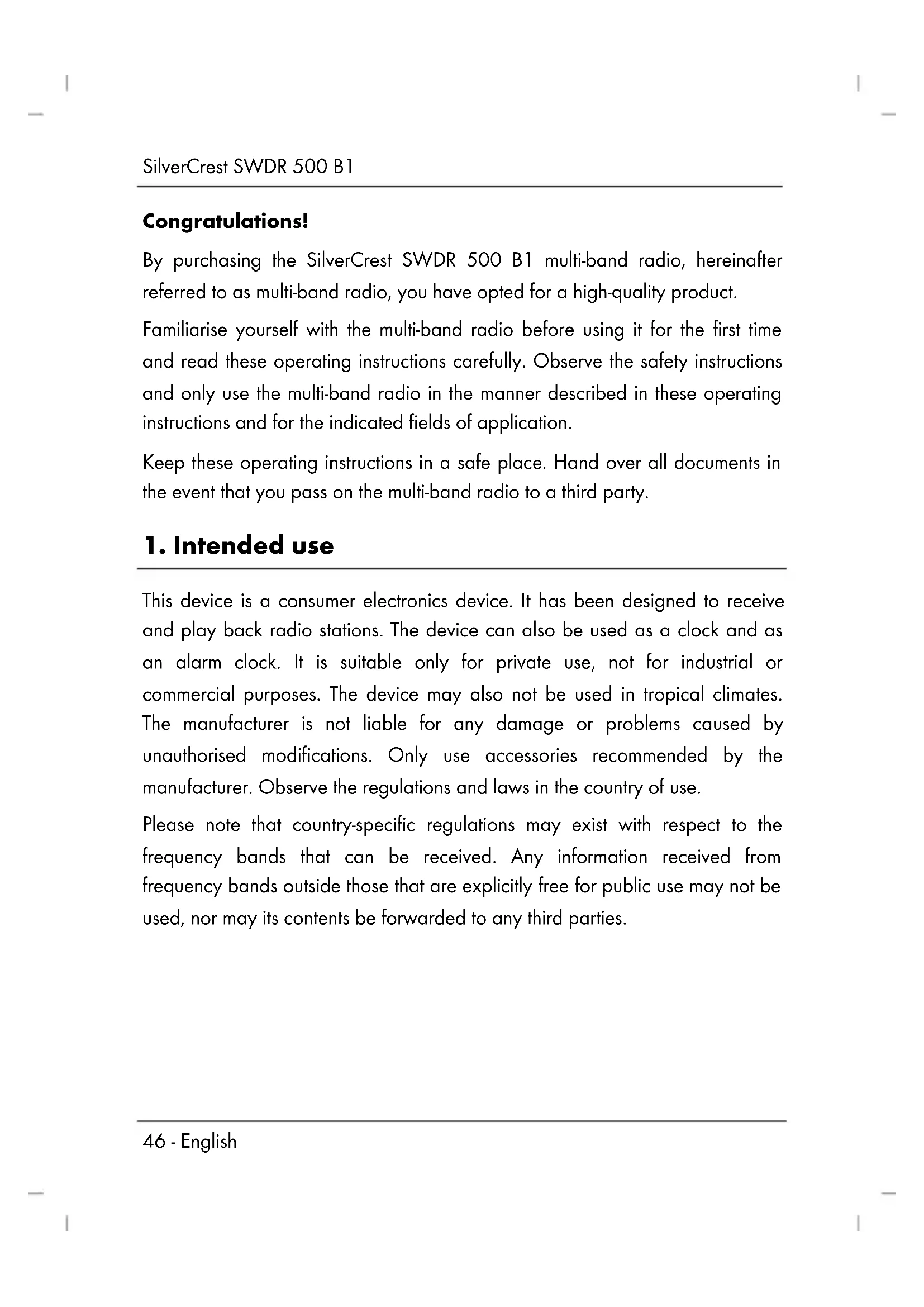 Congratulations! By purchasing the SilverCrest SWDR 500 B1 multi-band radio, hereinafter referred to as multi-band radio, you have opted for a high-quality product. Familiarise yourself with the multi-band radio before using it for the first time and read these operating instructions carefully. Observe the safety instructions and only use the multi-band radio in the manner described in these operating instructions and for the indicated fields of application. Keep these operating instructions in a safe place. Hand over all documents in the event that you pass on the multi-band radio to a third party.