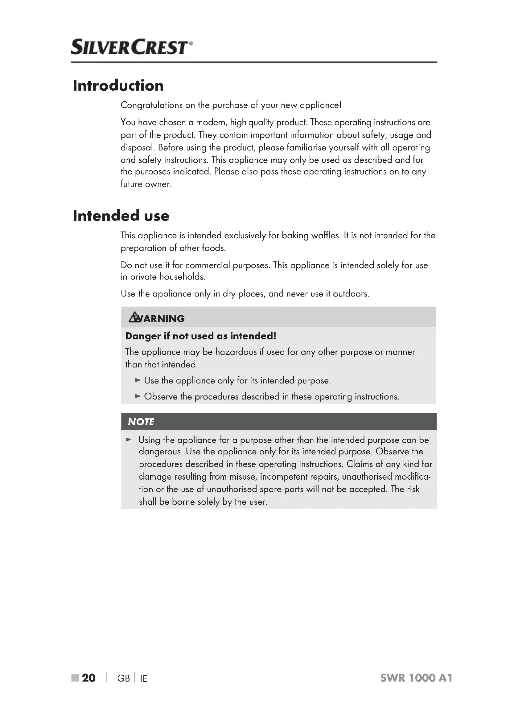 SWR 1000 A1 Introduction Congratulations on the purchase of your new appliance! You have chosen a modern, high-quality product. These operating instructions are part of the product. They contain important information about safety, usage and disposal. Before using the product, please familiarise yourself with all operating and safety instructions. This appliance may only be used as described and for the purposes indicated. Please also pass these operating instructions on to any future owner. Intended use This appliance is intended exclusively for baking waffles. It is not intended for the preparation of other foods. Do not use it for commercial purposes. This appliance is intended solely for use in private households. Use the appliance only in dry places, and never use it outdoors. WARNING Danger if not used as intended! The appliance may be hazardous if used for any other purpose or manner than that intended. ► Use the appliance only for its intended purpose. ► Observe the procedures described in these operating instructions. NOTE ► Using the appliance for a purpose other than the intended purpose can be dangerous. Use the appliance only for its intended purpose. Observe the procedures described in these operating instructions. Claims of any kind for damage resulting from misuse, incompetent repairs, unauthorised modifica- tion or the use of unauthorised spare parts will not be accepted. The risk shall be borne solely by the user.GB