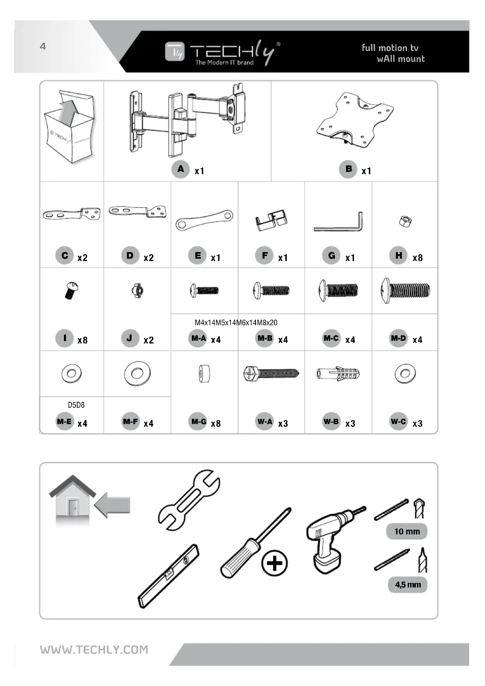 Dear Customer, thanks for choosing a Techly product.Unpacking Instructions Carefully open the carton, remove contents and lay out on cardboard or other protective surface to avoid damage. Check package contents against the Supplied Parts List in the next page to assure that all components were received undamaged. Do not use damaged or defective parts. Carefully read all instructions before attempting installation. Please keep this user's manual for future consultations.Note: The product is designed to be installed on wood stud walls, solid concrete walls or brick walls. If the hardware you need for your installation is not included, please consult your local hardware store for proper mounting hardware for the application.We cannot be held responsible for any injury and/or damage caused by incorrect installation. Before proceeding, please make sure the wall is suitable for installation. Respect the maximum load capacity indicated on the box of the product.ImportantSafety InformationPlease read this instruction before beginning the installation, and carefully follow all herein contained recommendations. Use proper safety equipment during installation. Please call a qualied installation contractor for help if you: Don't understand these directions or have any doubts about the safety of the installation. Are uncertain about the nature of your wall, consult a qualied installation contractor.Do not use this product for any purpose or in any conguration not explicitly specied in this instruction. We hereby disclaim any and all liability for injury or damage arising from incorrect assembly, incorrect mounting, or incorrect use of this product.At the end of the installation make sure the procedure was correctly observed.