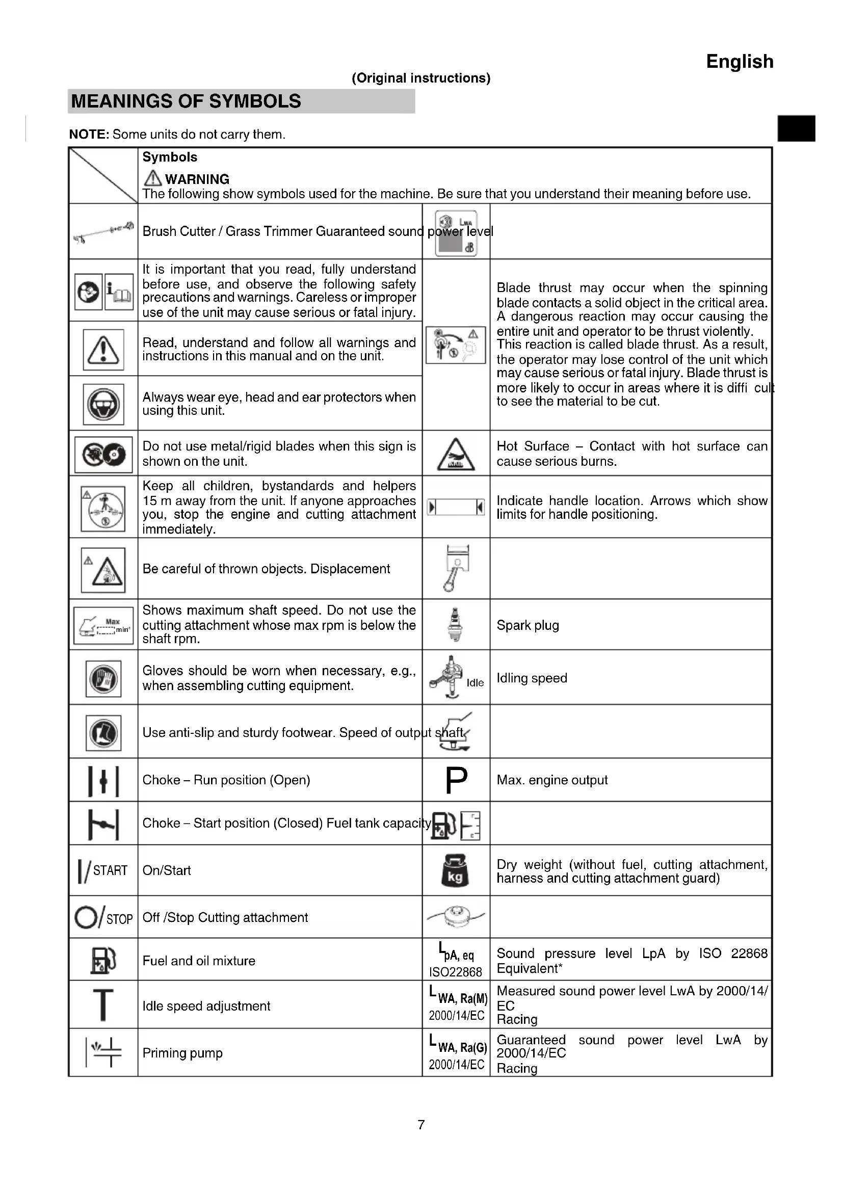 NOTE: Some units do not carry them. Symbols WARNING The following show symbols used for the machine. Be sure that you understand their meaning before use. Brush Cutter / Grass Trimmer Guaranteed sound power level It is important that you read, fully understand before use, and observe the following safety precautions and warnings. Careless or improper use of the unit may cause serious or fatal injury. Blade thrust may occur when the spinning blade contacts a solid object in the critical area. A dangerous reaction may occur causing the entire unit and operator to be thrust violently. This reaction is called blade thrust. As a result, the operator may lose control of the unit which may cause serious or fatal injury. Blade thrust is more likely to occur in areas where it is diffi cult to see the material to be cut. Read, understand and follow all warnings and instructions in this manual and on the unit. Always wear eye, head and ear protectors when using this unit. Do not use metal/rigid blades when this sign is shown on the unit. Hot Surface – Contact with hot surface can cause serious burns. Keep all children, bystandards and helpers 15 m away from the unit. If anyone approaches you, stop the engine and cutting attachment immediately. Indicate handle location. Arrows which show limits for handle positioning. Be careful of thrown objects. Displacement min