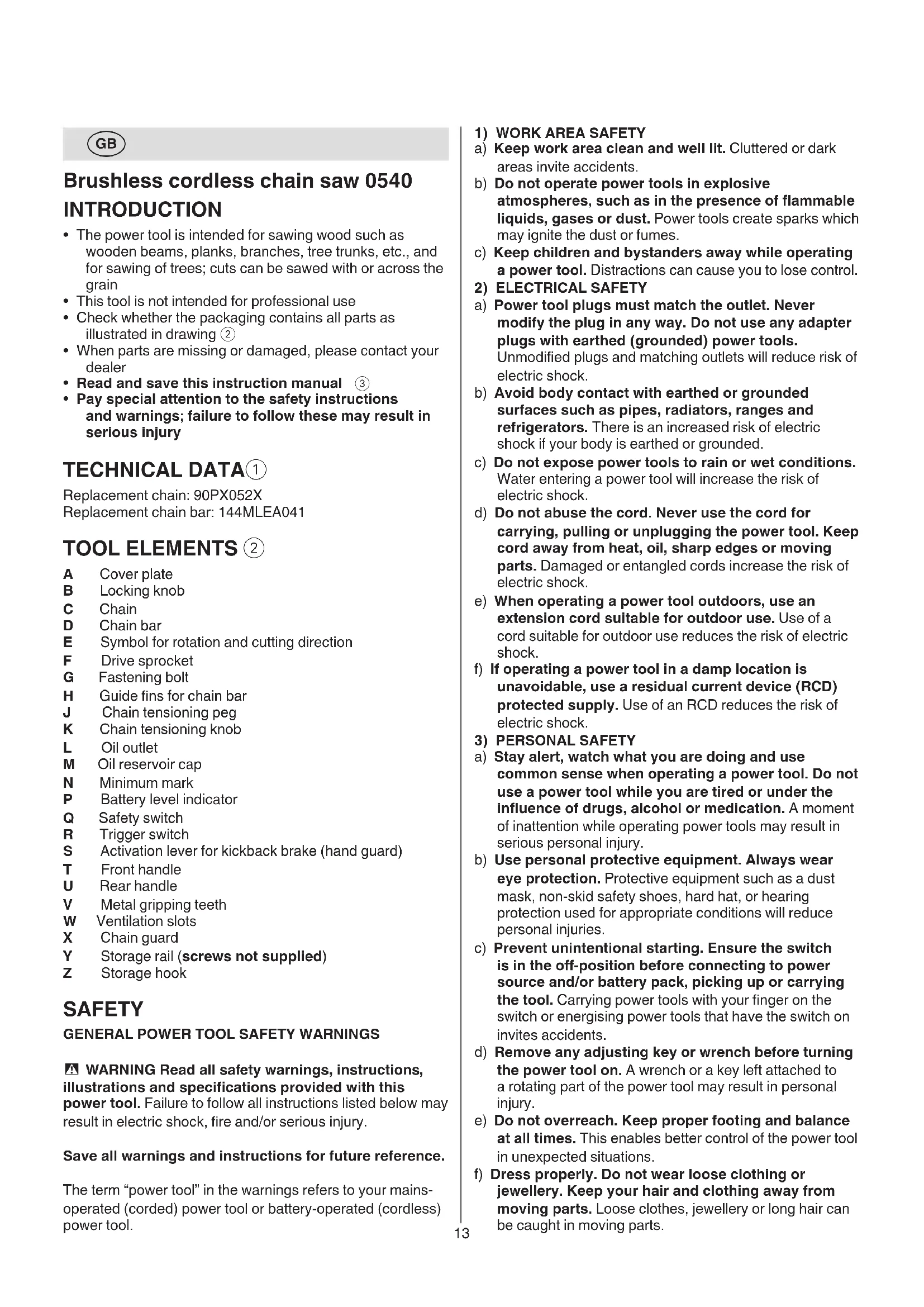 A Cover plate B Locking knob C Chain D Chain bar E Symbol for rotation and cutting direction F Drive sprocket G Fastening bolt H Guide ns for chain bar J Chain tensioning peg K Chain tensioning knob L Oil outlet M Oil reservoir cap N Minimum mark P Battery level indicator Q Safety switch R Trigger switch S Activation lever for kickback brake (hand guard) T Front handle U Rear handle V Metal gripping teeth W Ventilation slots X Chain guard Y Storage rail (screws not supplied) Z Storage hook SAFETY
