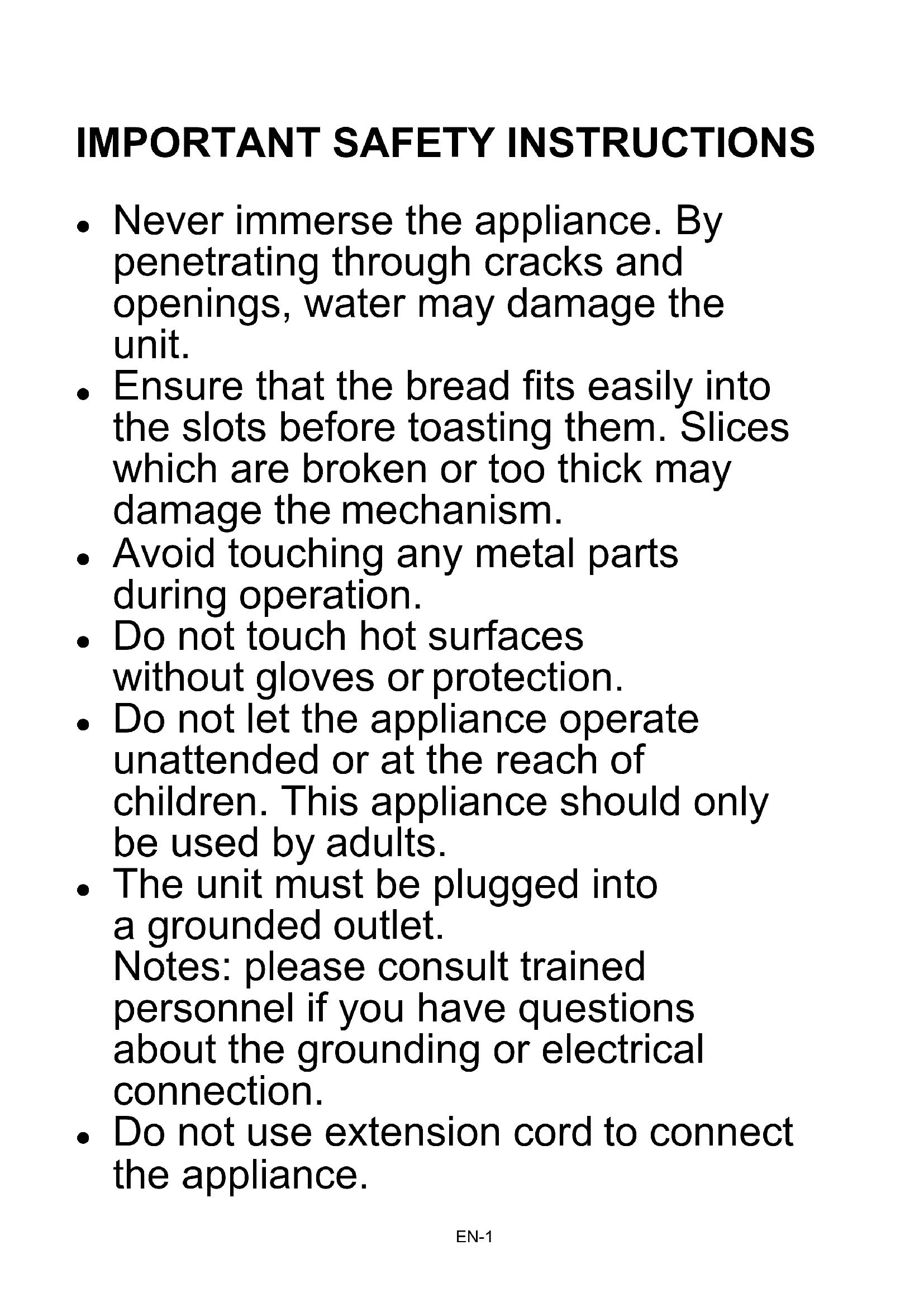 EN-7USING YOUR APPLIANCE FOR THE FIRST TIME At first use, it is possible that you notice a slight burning smell while the toaster heats. This is absolutely normal. Just let the toaster heat until the smell disappears. We advise you to operate the toaster without inserting bread for first use.