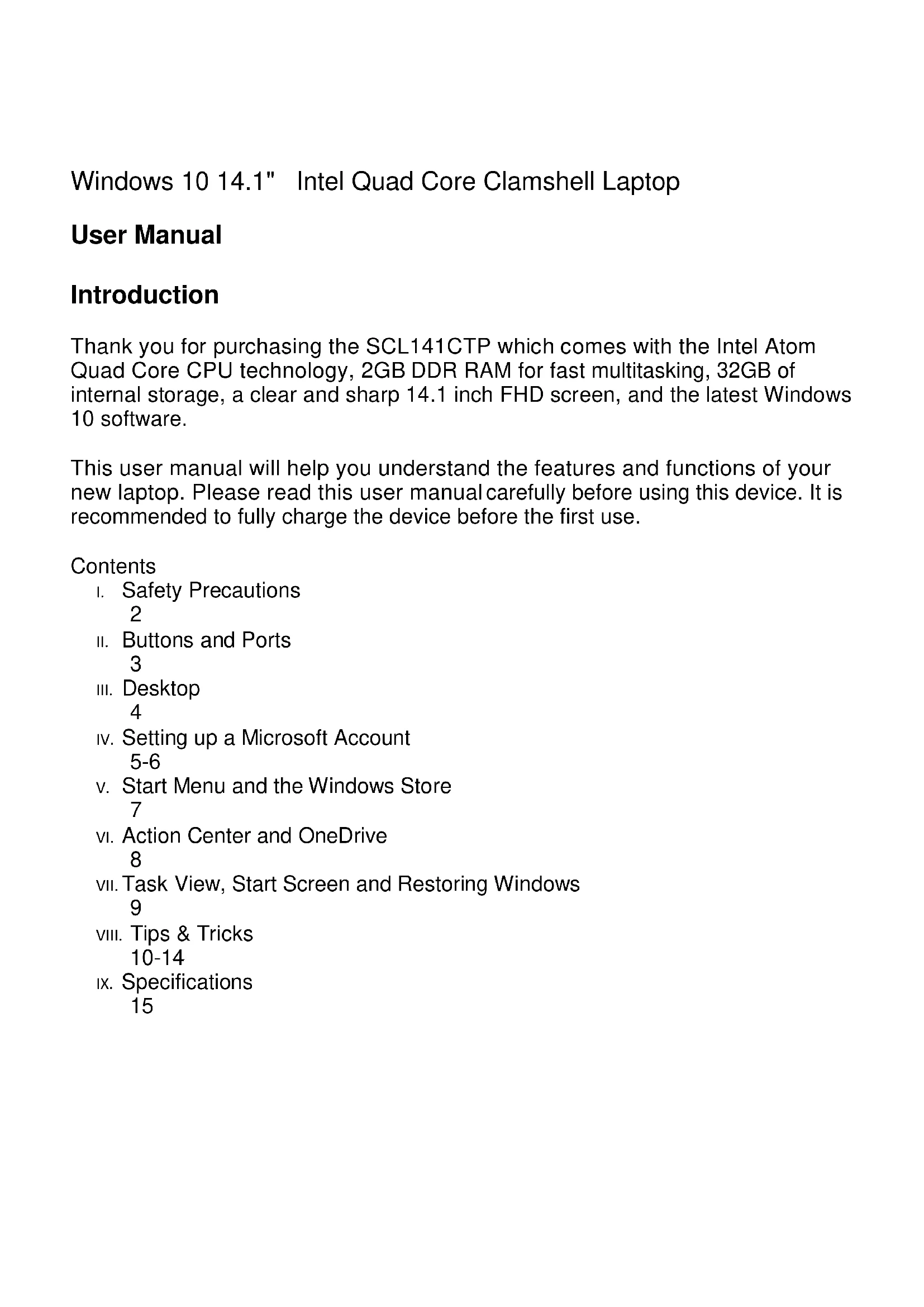 This user manual will help you understand the features and functions of your new laptop. Please read this user manual carefully before using this device. It is recommended to fully charge the device before the first use. Contents