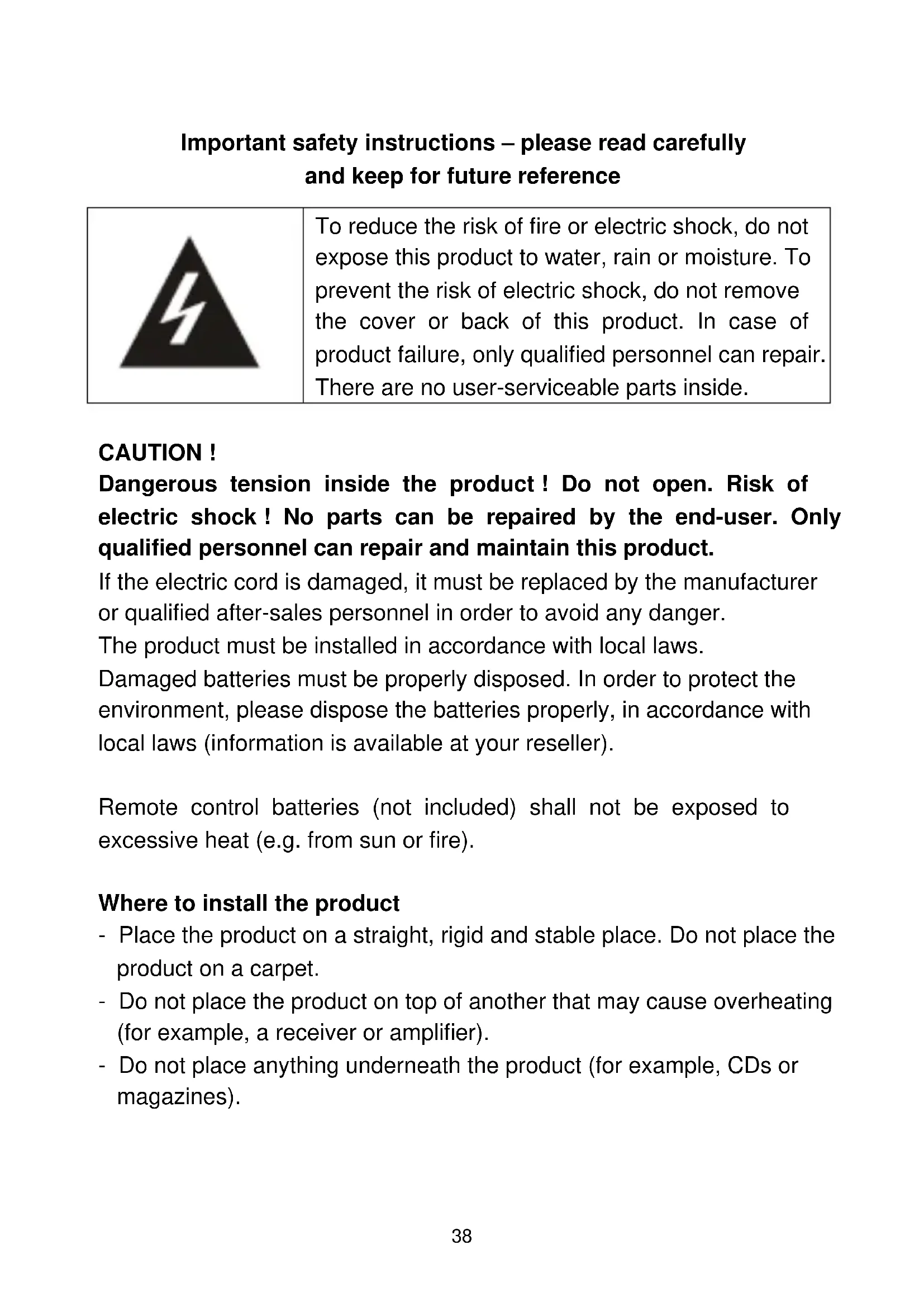 SAV ADMEA / LOGISAV ZI du clos des charmes 26 rue du clos des charmes 77090 COLLEGIEN - France38 Important safety instructions – please read carefully and keep for future reference To reduce the risk of fire or electric shock, do not expose this product to water, rain or moisture. To prevent the risk of electric shock, do not remove the cover or back of this product. In case of product failure, only qualified personnel can repair. There are no user-serviceable parts inside. CAUTION ! Dangerous tension inside the product ! Do not open. Risk of electric shock ! No parts can be repaired by the end-user. Only qualified personnel can repair and maintain this product. If the electric cord is damaged, it must be replaced by the manufacturer or qualified after-sales personnel in order to avoid any danger. The product must be installed in accordance with local laws. Damaged batteries must be properly disposed. In order to protect the environment, please dispose the batteries properly, in accordance with local laws (information is available at your reseller). Remote control batteries (not included) shall not be exposed to excessive heat (e.g. from sun or fire). Where to install the product - Place the product on a straight, rigid and stable place. Do not place the product on a carpet. - Do not place the product on top of another that may cause overheating (for example, a receiver or amplifier). - Do not place anything underneath the product (for example, CDs or magazines).39 Proper ventilation - Place the product in a sufficiently–aerated place to avoid overheating. Allow at least 10cm spacing at the back and top of the product, and 5cm spacing on both sides to prevent overheating. - Do not place items such as newspapers, tablecloth, curtains, in front of the ventilating openings. Do not expose the product to high temperatures, moisture, water and dust. - The apparatus shall not be exposed to dripping or splashing. No object filled with liquids, such as vases, shall be placed on the apparatus. - Do not place other items close to this product that may damage it (for example, objects containing water or lightened candles). - No naked flame sources, such as lighted candles, should be placed on the apparatus. Electric supply - Please unplug the product in case of prolonged non-use. - If the supply cable is damaged, it must be replaced by the manufacturer or qualified after-sales personnel to avoid any danger. - This product must be connected to an electrical supply 230V ~ 50Hz. - The mains plug is used as the disconnect device, so the disconnect device shall remain readily operable40 WARNING Never place a television set in an unstable location. A television set may fall, causing serious personal injury or death. Many injuries, particularly to children, can be avoided by taking simple precautions such as: - Using cabinets or stands recommended by the manufacturer of the television set. - Only using furniture that can safely support the television set. - Ensuring the television set is not overhanging the edge of the supporting furniture. - Not placing the television set on tall furniture (for example, cupboards or bookcases) without anchoring both the furniture and the television set to a suitable support. - Not placing the television set on cloth or other ma terials that may be located between the television set and supporting furniture. - Educating children about the dangers of climbing on furniture to reach the television set or its controls. - In case this television set is to be relocated to a different location, please keep in mind and apply the above safety instructions. Declaration of conformity This appliance is Television complies with the essential requirements and other provisions of Directive 2014/35/EU & 2014/30EU and the Radio Equipment Directive (RED) 2014/53/EU that goes into effect on 12 June 2016. The declaration of conformity is available on website: http://www.schneiderconsumer.com41 Technical Specification: Name: Television Product Net Weight: 19Kg Operation Temperature: 0 ~40℃ ℃ TV Reception System: DVB-T