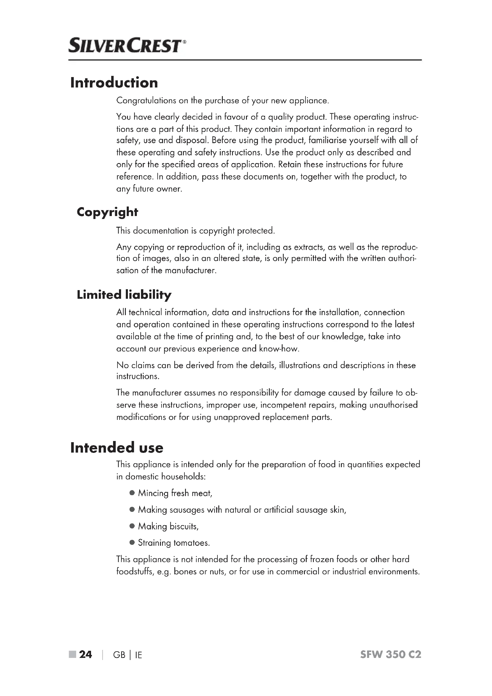Introduction Congratulations on the purchase of your new appliance. You have clearly decided in favour of a quality product. These operating instruc- tions are a part of this product. They contain important information in regard to safety, use and disposal. Before using the product, familiarise yourself with all of these operating and safety instructions. Use the product only as described and only for the specified areas of application. Retain these instructions for future reference. In addition, pass these documents on, together with the product, to any future owner. Copyright This documentation is copyright protected. Any copying or reproduction of it, including as extracts, as well as the reproduc- tion of images, also in an altered state, is only permitted with the written authori- sation of the manufacturer. Limited liability All technical information, data and instructions for the installation, connection and operation contained in these operating instructions correspond to the latest available at the time of printing and, to the best of our knowledge, take into account our previous experience and know-how. No claims can be derived from the details, illustrations and descriptions in these instructions. The manufacturer assumes no responsibility for damage caused by failure to ob- serve these instructions, improper use, incompetent repairs, making unauthorised modifications or for using unapproved replacement parts. Intended use This appliance is intended only for the preparation of food in quantities expected in domestic households: ▯ Mincing fresh meat, ▯ Making sausages with natural or artificial sausage skin, ▯ Making biscuits, ▯ Straining tomatoes. This appliance is not intended for the processing of frozen foods or other hard foodstuffs, e.g. bones or nuts, or for use in commercial or industrial environments.SFW 350 C2
