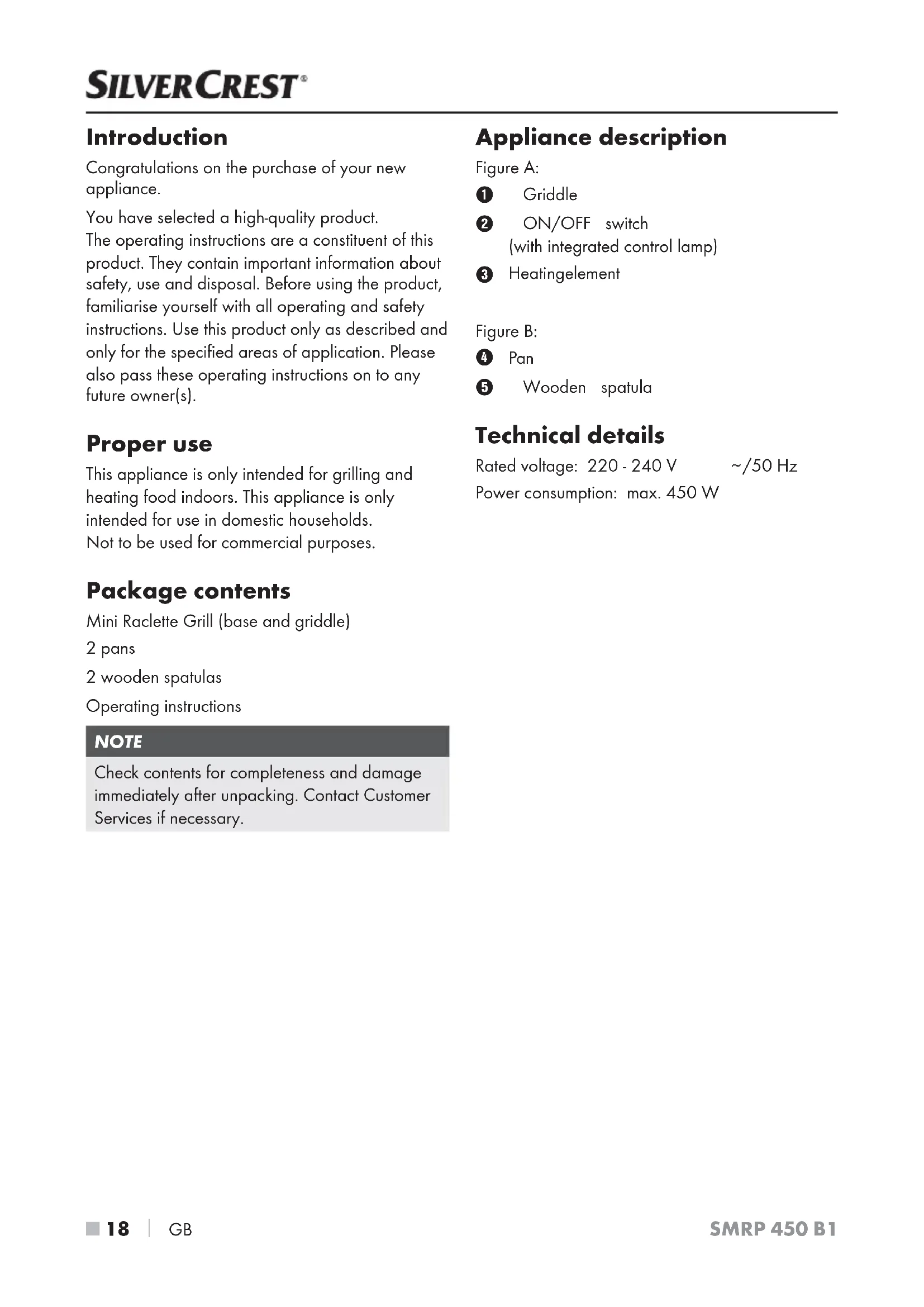GB SMRP 450 B1 Introduction Congratulations on the purchase of your new appliance. You have selected a high-quality product. The operating instructions are a constituent of this product. They contain important information about safety, use and disposal. Before using the product, familiarise yourself with all operating and safety instructions. Use this product only as described and only for the specified areas of application. Please also pass these operating instructions on to any future owner(s). Proper use This appliance is only intended for grilling and heating food indoors. This appliance is only intended for use in domestic households. Not to be used for commercial purposes. Package contents Mini Raclette Grill (base and griddle) 2 pans 2 wooden spatulas Operating instructions NOTE Check contents for completeness and damage immediately after unpacking. Contact Customer Services if necessary. Appliance description Figure A: Griddle ON/OFF switch (with integrated control lamp)