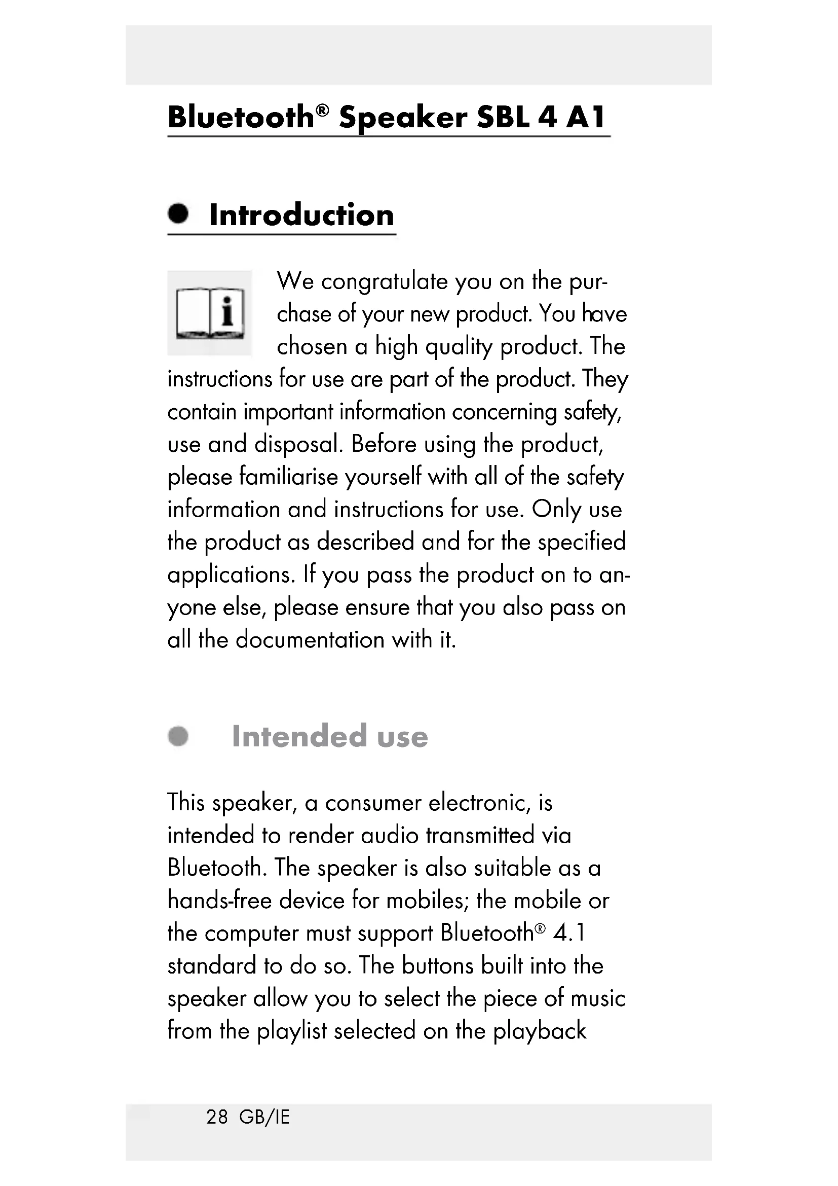 Speaker SBL 4 A1 Introduction We congratulate you on the pur- chase of your new product. You h ave chosen a high quality product. The instructions for use are part of the product. They contain important information concerning saf ety, use and disposal. Before using the product, please familiarise yourself with all of the safety information and instructions for use. Only use the product as described and for the specified applications. If you pass the product on to an- yone else, please ensure that you also pass on all the documentation with it. Intended use This speaker, a consumer electronic, is intended to render audio transmitted via Bluetooth. The speaker is also suitable as a hands-free device for mobiles; the mobile or the computer must support Bluetooth