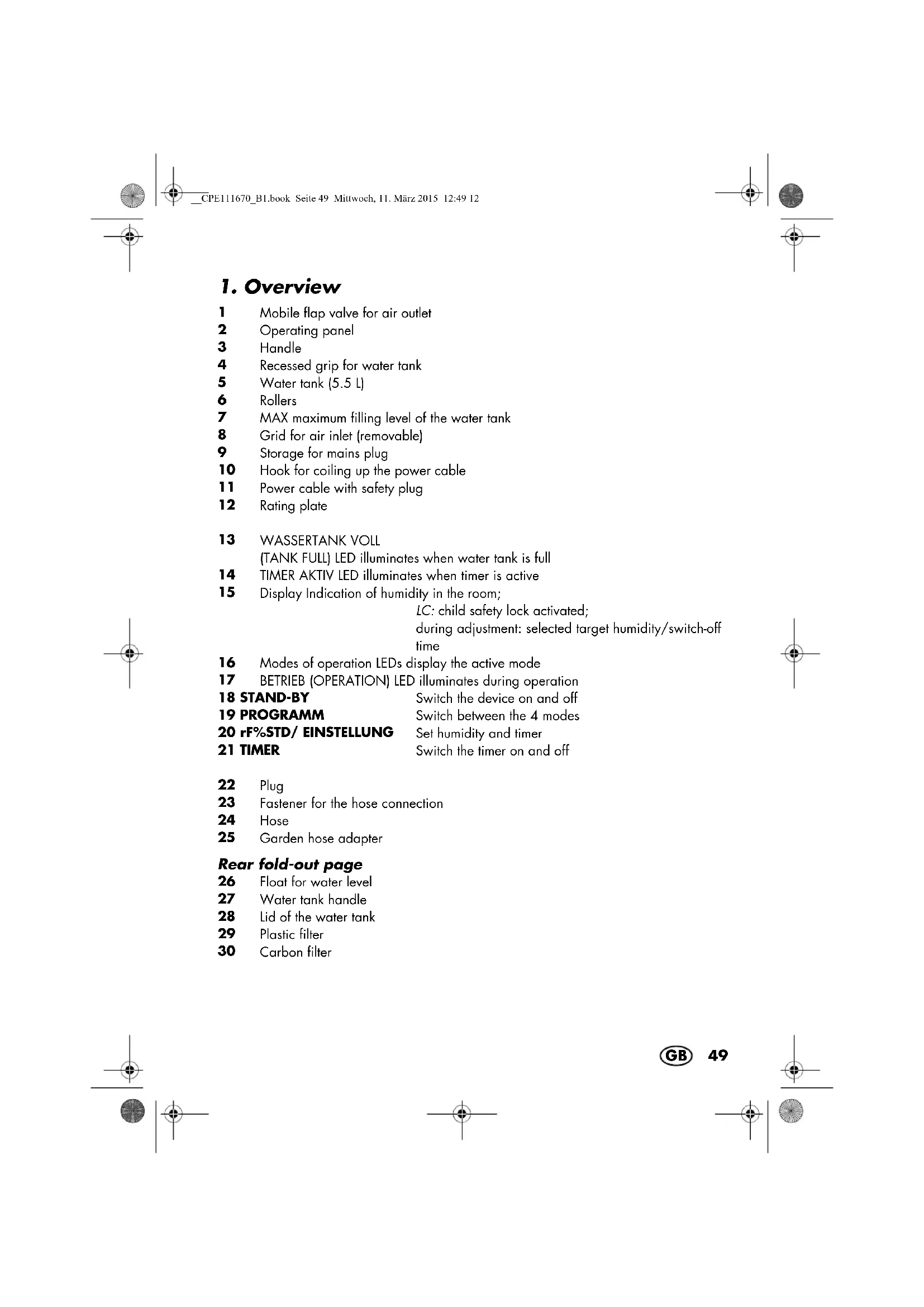 BETRIEB (OPERATION) LED illuminates during operation 18 STAND-BY Switch the device on and off 19 PROGRAMM Switch between the 4 modes 20 rF%STD/ EINSTELLUNG Set humidity and timer 21 TIMER Switch the timer on and off