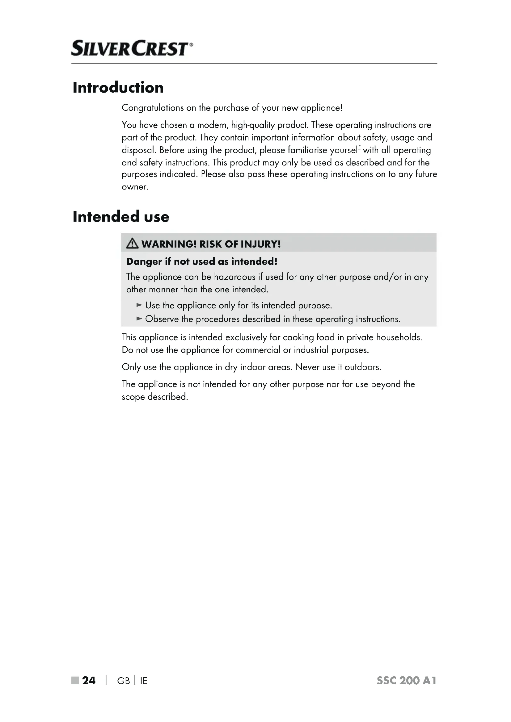 SSC 200 A1 Introduction Congratulations on the purchase of your new appliance! You have chosen a modern, high-quality product. These operating instructions are part of the product. They contain important information about safety, usage and disposal. Before using the product, please familiarise yourself with all operating and safety instructions. This product may only be used as described and for the purposes indicated. Please also pass these operating instructions on to any future owner. Intended use WARNING! RISK OF INJURY! Danger if not used as intended! The appliance can be hazardous if used for any other purpose and/or in any other manner than the one intended. ► Use the appliance only for its intended purpose. ► Observe the procedures described in these operating instructions. This appliance is intended exclusively for cooking food in private households. Do not use the appliance for commercial or industrial purposes. Only use the appliance in dry indoor areas. Never use it outdoors. The appliance is not intended for any other purpose nor for use beyond the scope described. IB_336973_SSC200A1_LB8.indb 24 07.07.2020 10:46:26GB