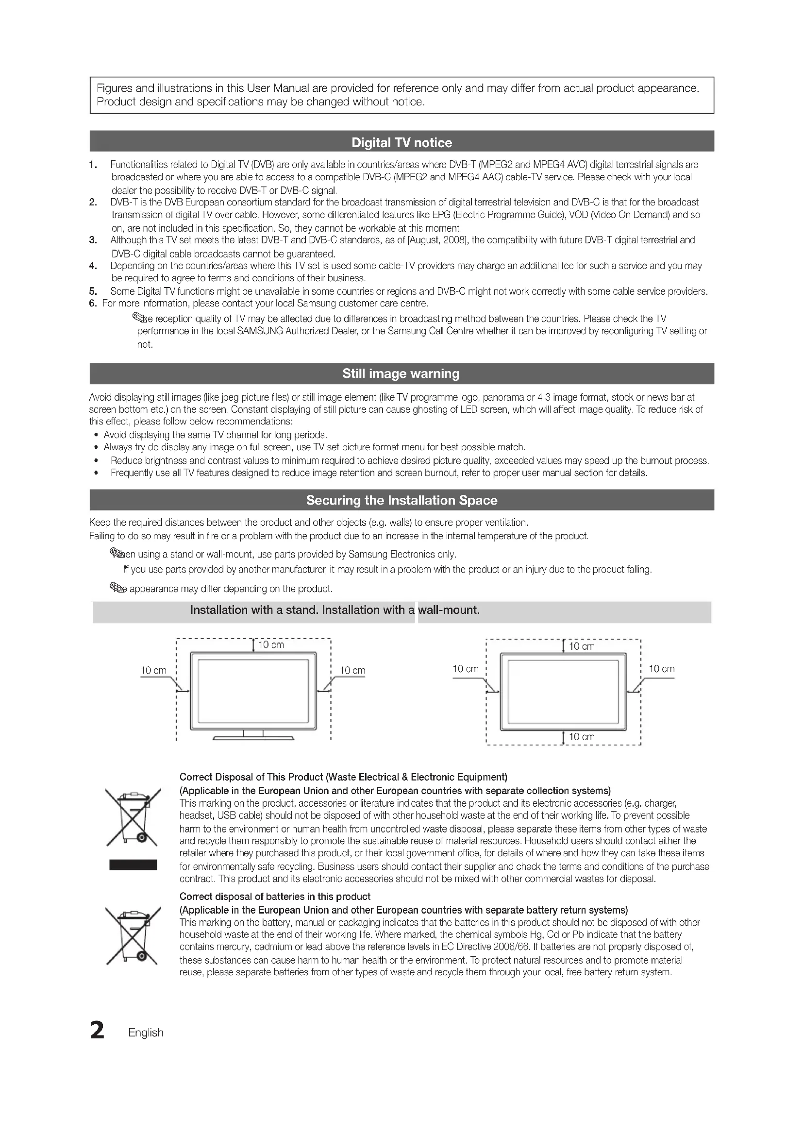 - Frequently use all TV features designed to reduce image retention and screen burnout, refer to proper user manual section for details. Securing the Installation Space Keep the required distances between the product and other objects (e.g. walls) to ensure proper ventilation. Failing to do so may result in fire or a problem with the product due to an increase in the internal temperature of the product.