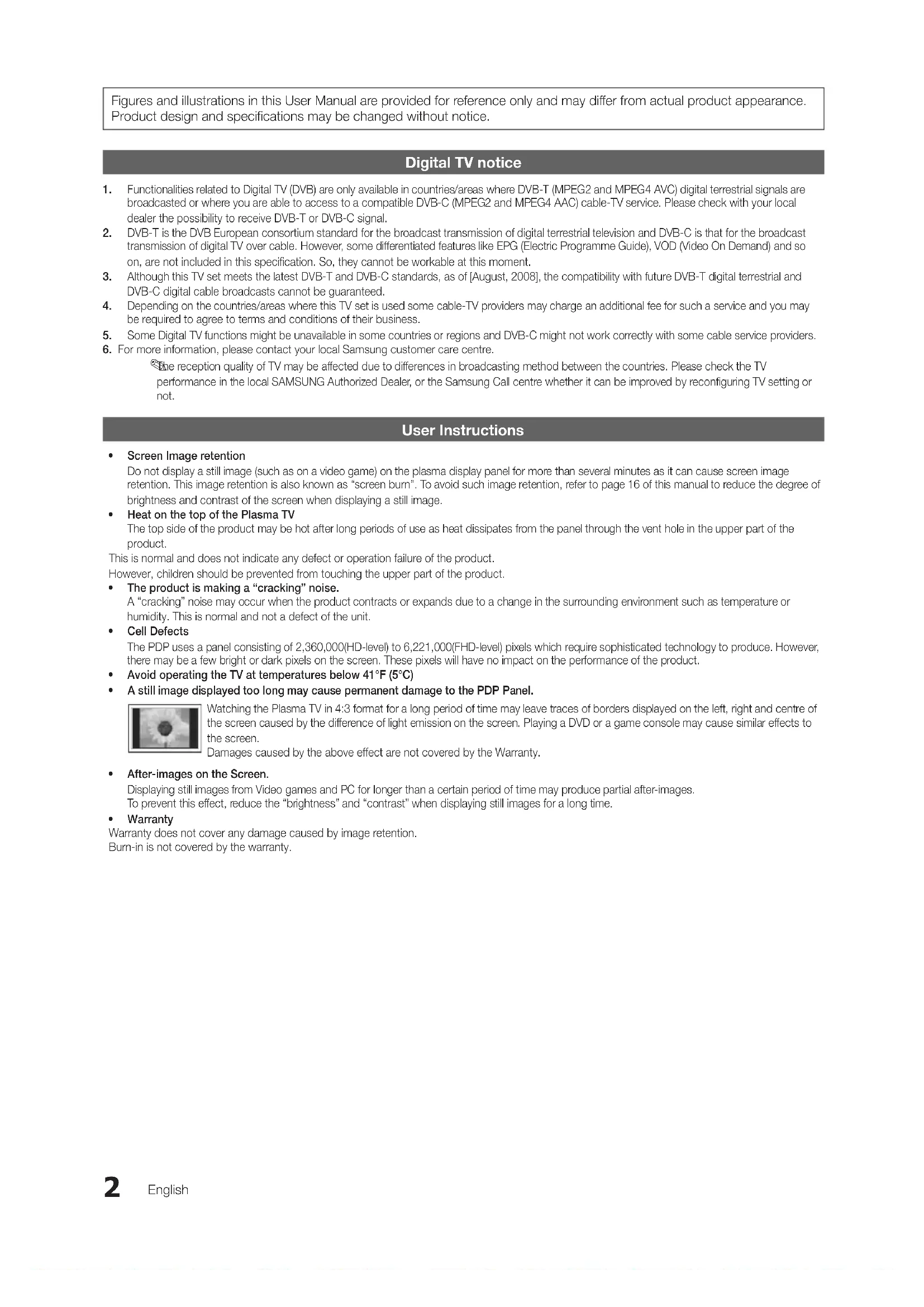 - A still image displayed too long may cause permanent damage to the PDP Panel. Watching the Plasma TV in 4:3 format for a long period of time may leave traces of borders displayed on the left, right and centre of the screen caused by the difference of light emission on the screen. Playing a DVD or a game console may cause similar effects to the screen. Damages caused by the above effect are not covered by the Warranty.