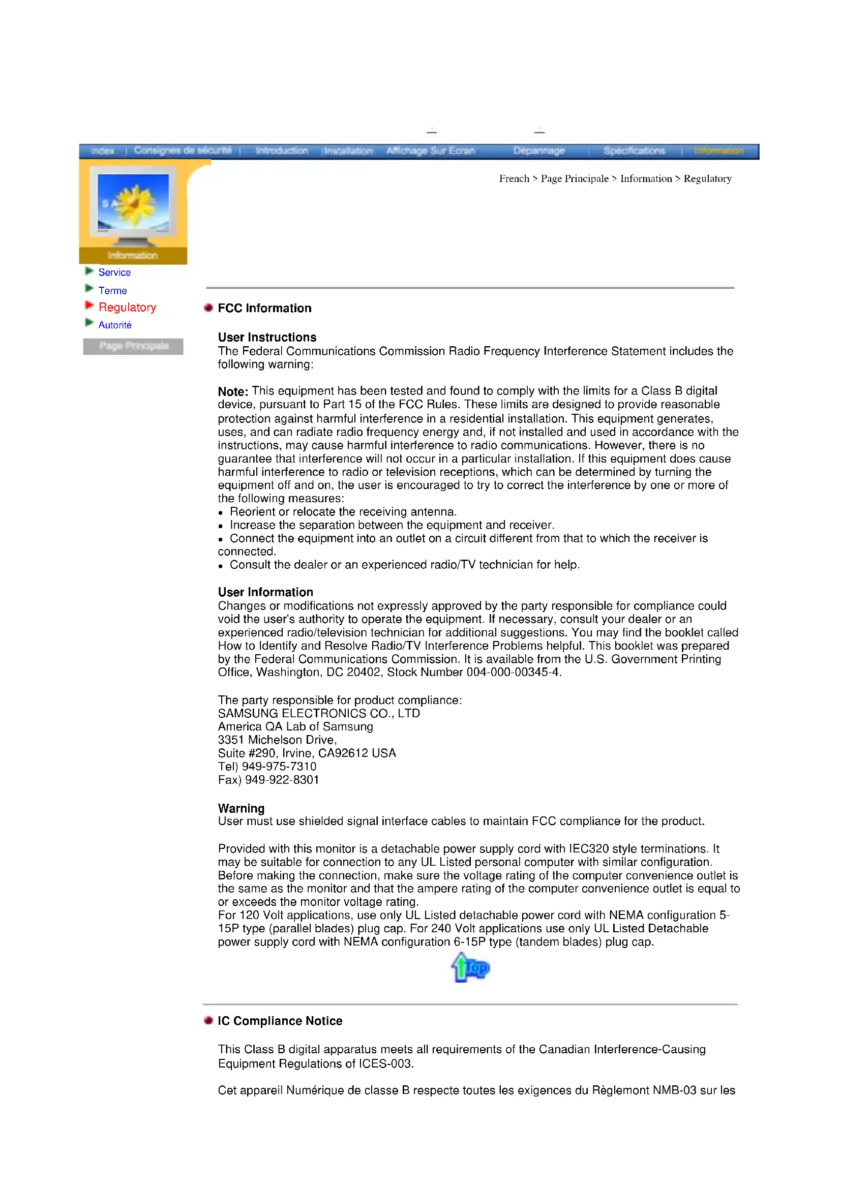 America QA Lab of Samsung 3351 Michelson Drive, Suite #290, Irvine, CA92612 USA Tel) 949-975-7310 Fax) 949-922-8301 Warning User must use shielded signal interface cables to maintain FCC compliance for the product. Provided with this monitor is a detachable power supply cord with IEC320 style terminations. It may be suitable for connection to any UL Listed personal computer with similar configuration. Before making the connection, make sure the voltage rating of the computer convenience outlet is the same as the monitor and that the ampere rating of the computer convenience outlet is equal to or exceeds the monitor voltage rating. For 120 Volt applications, use only UL Listed detachable power cord with NEMA configuration 5- 15P type (parallel blades) plug cap. For 240 Volt applications use only UL Listed Detachable power supply cord with NEMA configuration 6-15P type (tandem blades) plug cap. IC Compliance Notice This Class B digital apparatus meets all requirements of the Canadian Interference-Causing Equipment Regulations of ICES-003. Cet appareil Numérique de classe B respecte toutes les exigences du Règlemont NMB-03 sur leséquipements produisant des interférences au Canada. MPR II Compliance(Except SyncMaster 551v) This monitor complies with SWEDAC(MPR II) recommendations for reduced electric and magnetic fields. European Notice (Europe only) Products with the CE Marking comply with both the EMC Directive (89/336/EEC), (92/31/EEC), (93/68/EEC) and the Low Voltage Directive (73/23/EEC) issued by the Commission of the European Community. Compliance with these directives implies conformity to the following European Norms: z EN55022:1998+A1:2000 - Radio Frequency Interference z EN55024:1998 - Electromagnetic Immunity z EN61000-3-2:1995+A1/A2:1998 - Power Line Harmonics