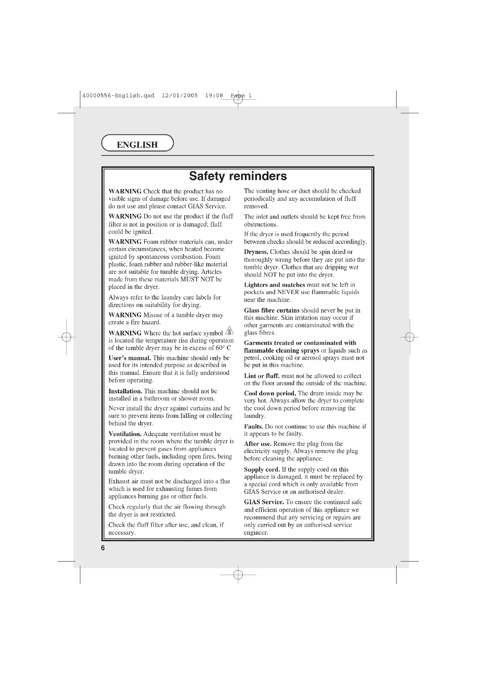 This appliance must be operated in accordance with the instructions given in this manual. It is for domestic use only in drying household textiles and garments where a water solution has been used in the cleaning process. It MUST NOT be used with dry cleaning fluids. For your safety, this dryer must be correctly installed. If there is any doubt about installation, call the national GIAS Service number for advice. WARNING!