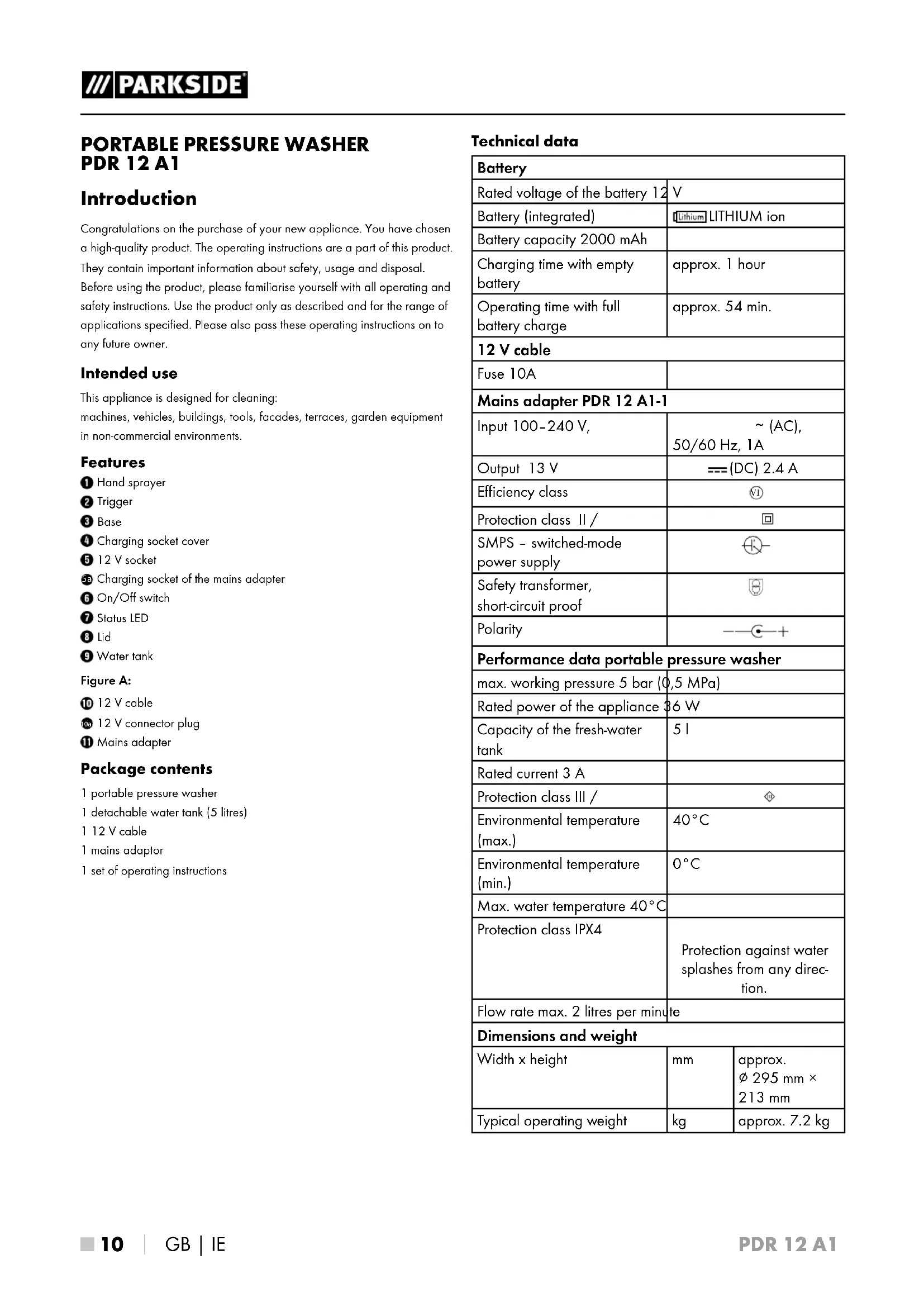 Protection class II / SMPS – switched-mode power supply Safety transformer, short-circuit proof Polarity Performance data portable pressure washer max. working pressure 5 bar (0,5 MPa) Rated power of the appliance 36 W Capacity of the fresh-water tank 5 l Rated current 3 A Protection class III / Environmental temperature (max.) 40°C Environmental temperature (min.) 0°C Max. water temperature 40°C Protection class IPX4 Protection against water splashes from any direc- tion. Flow rate max. 2 litres per minute Dimensions and weight Width x height mm approx. ∅ 295 mm × 213 mm Typical operating weight kg approx. 7.2 kgPDR 12 A1 GB│IE