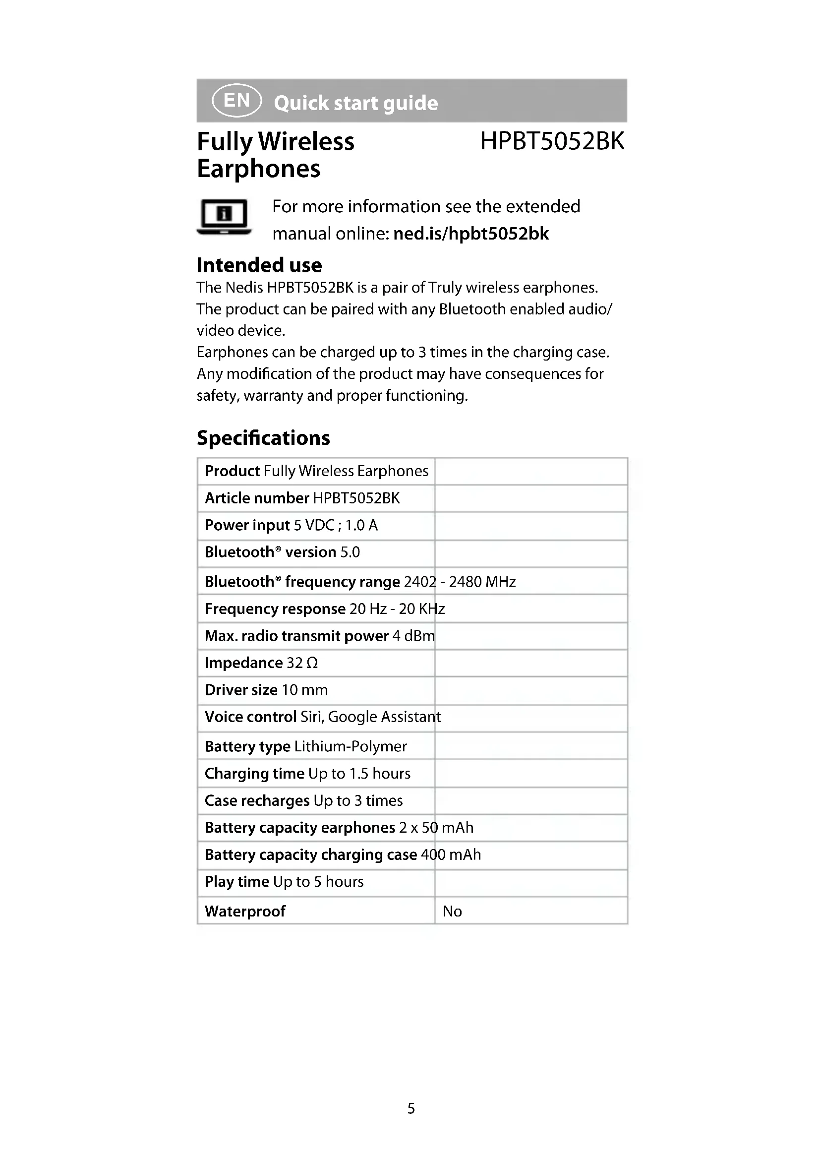 Quick start guide Fully Wireless Earphones HPBT5052BK For more information see the extended manual online: ned.is/hpbt5052bk Intended use The Nedis HPBT5052BK is a pair of Truly wireless earphones. The product can be paired with any Bluetooth enabled audio/ video device. Earphones can be charged up to 3 times in the charging case. Any modication of the product may have consequences for safety, warranty and proper functioning. Specications Product Fully Wireless Earphones Article number HPBT5052BK Power input 5 VDC ; 1.0 A Bluetooth® version 5.0 Bluetooth® frequency range 2402 - 2480 MHz Frequency response 20 Hz - 20 KHz Max. radio transmit power 4 dBm Impedance 32 Ω Driver size 10 mm Voice control Siri, Google Assistant Battery type Lithium-Polymer Charging time Up to 1.5 hours Case recharges Up to 3 times Battery capacity earphones 2 x 50 mAh Battery capacity charging case 400 mAh Play time Up to 5 hours Waterproof No6 Main parts (image A)
