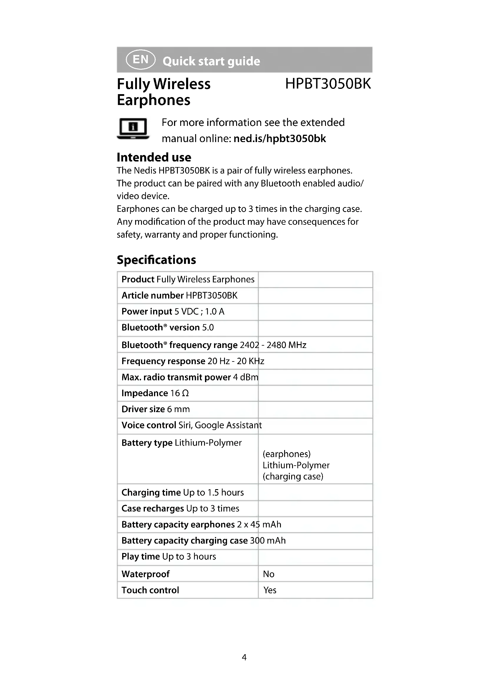 Quick start guide Fully Wireless Earphones HPBT3050BK For more information see the extended manual online: ned.is/hpbt3050bk Intended use The Nedis HPBT3050BK is a pair of fully wireless earphones. The product can be paired with any Bluetooth enabled audio/ video device. Earphones can be charged up to 3 times in the charging case. Any modication of the product may have consequences for safety, warranty and proper functioning. Specications Product Fully Wireless Earphones Article number HPBT3050BK Power input 5 VDC ; 1.0 A Bluetooth® version 5.0 Bluetooth® frequency range 2402 - 2480 MHz Frequency response 20 Hz - 20 KHz Max. radio transmit power 4 dBm Impedance 16 Ω Driver size 6 mm Voice control Siri, Google Assistant Battery type Lithium-Polymer (earphones) Lithium-Polymer (charging case) Charging time Up to 1.5 hours Case recharges Up to 3 times Battery capacity earphones 2 x 45 mAh Battery capacity charging case 300 mAh Play time Up to 3 hours Waterproof No Touch control Yes5 Main parts (image A)