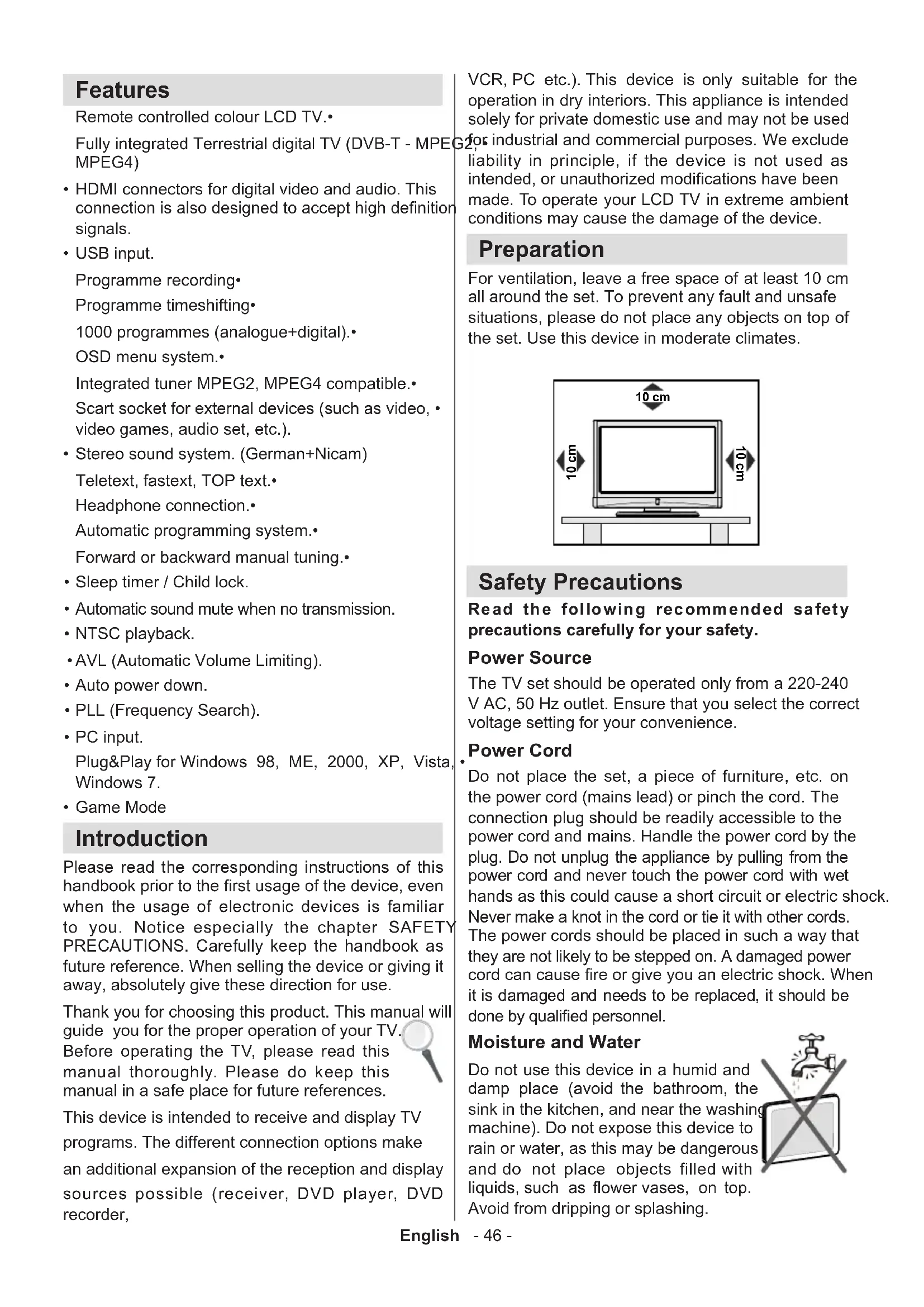 Introduction Please read the corresponding instructions of this handbook prior to the rst usage of the device, even when the usage of electronic devices is familiar to you. Notice especially the chapter SAFETY PRECAUTIONS. Carefully keep the handbook as future reference. When selling the device or giving it away, absolutely give these direction for use. Thank you for choosing this product. This manual will guide you for the proper operation of your TV. Before operating the TV, please read this manual thoroughly. Please do keep this manual in a safe place for future references. This device is intended to receive and display TV programs. The different connection options make an additional expansion of the reception and display sources possible (receiver, DVD player, DVD recorder, VCR, PC etc.). This device is only suitable for the operation in dry interiors. This appliance is intended solely for private domestic use and may not be used for industrial and commercial purposes. We exclude liability in principle, if the device is not used as intended, or unauthorized modications have been made. To operate your LCD TV in extreme ambient conditions may cause the damage of the device. Preparation For ventilation, leave a free space of at least 10 cm all around the set. To prevent any fault and unsafe situations, please do not place any objects on top of the set. Use this device in moderate climates. 10 cm 10 cm 10 cm Safety Precautions Read the following recommended safety precautions carefully for your safety. Power Source The TV set should be operated only from a 220-240 V AC, 50 Hz outlet. Ensure that you select the correct voltage setting for your convenience. Power Cord Do not place the set, a piece of furniture, etc. on the power cord (mains lead) or pinch the cord. The connection plug should be readily accessible to the power cord and mains. Handle the power cord by the plug. Do not unplug the appliance by pulling from the power cord and never touch the power cord with wet hands as this could cause a short circuit or electric shock. Never make a knot in the cord or tie it with other cords. The power cords should be placed in such a way that they are not likely to be stepped on. A damaged power cord can cause re or give you an electric shock. When it is damaged and needs to be replaced, it should be done by qualied personnel. Moisture and Water Do not use this device in a humid and damp place (avoid the bathroom, the sink in the kitchen, and near the washing machine). Do not expose this device to rain or water, as this may be dangerous and do not place objects filled with liquids, such as ower vases, on top. Avoid from dripping or splashing.English - 47 - If any solid object or liquid falls into the cabinet, unplug the TV and have it checked by qualied personnel before operating it any further. Cleaning Before cleaning, unplug the TV set from the wall outlet. Do not use liquid or aerosol cleaners. Use soft and dry cloth. Ventilation The slots and openings on the TV set are intended for ventilation and to ensure reliable operation. To prevent overheating, these openings must not be blocked or covered in anyway. Heat and Flames The set should not be placed near to open ames and sources of intense heat such as an electric heater. Ensure that no open ame sources, such as lighted candles, are placed on top of the TV. Batteries should not be exposed to excessive heat such as sunshine, re or the like. Lightning In case of storm and lightning or when going on holiday, disconnect the power cord from the wall outlet. Replacement Parts When replacement parts are required, make sure that the service technician has used replacement parts, which are specied by the manufacturer or have the same specications as the original one. Unauthorized substitutions may result in re, electrical shock or other hazards. Servicing Please refer all servicing to qualied personnel. Do not remove the cover yourself as this may result in an electric shock. Waste Disposal Instructions for waste disposal:• Packaging and packaging aids are recyclable and should principally be recycled. Packaging materials, such as foil bag, must be kept away from children. Batteries, including those which are heavy metal-free, should not be disposed of with household waste. Please dispose of used battery in an environment friendly manner. Find out about the legal regulations which apply in your area. Don’t try to recharge batteries. Danger of explosion.