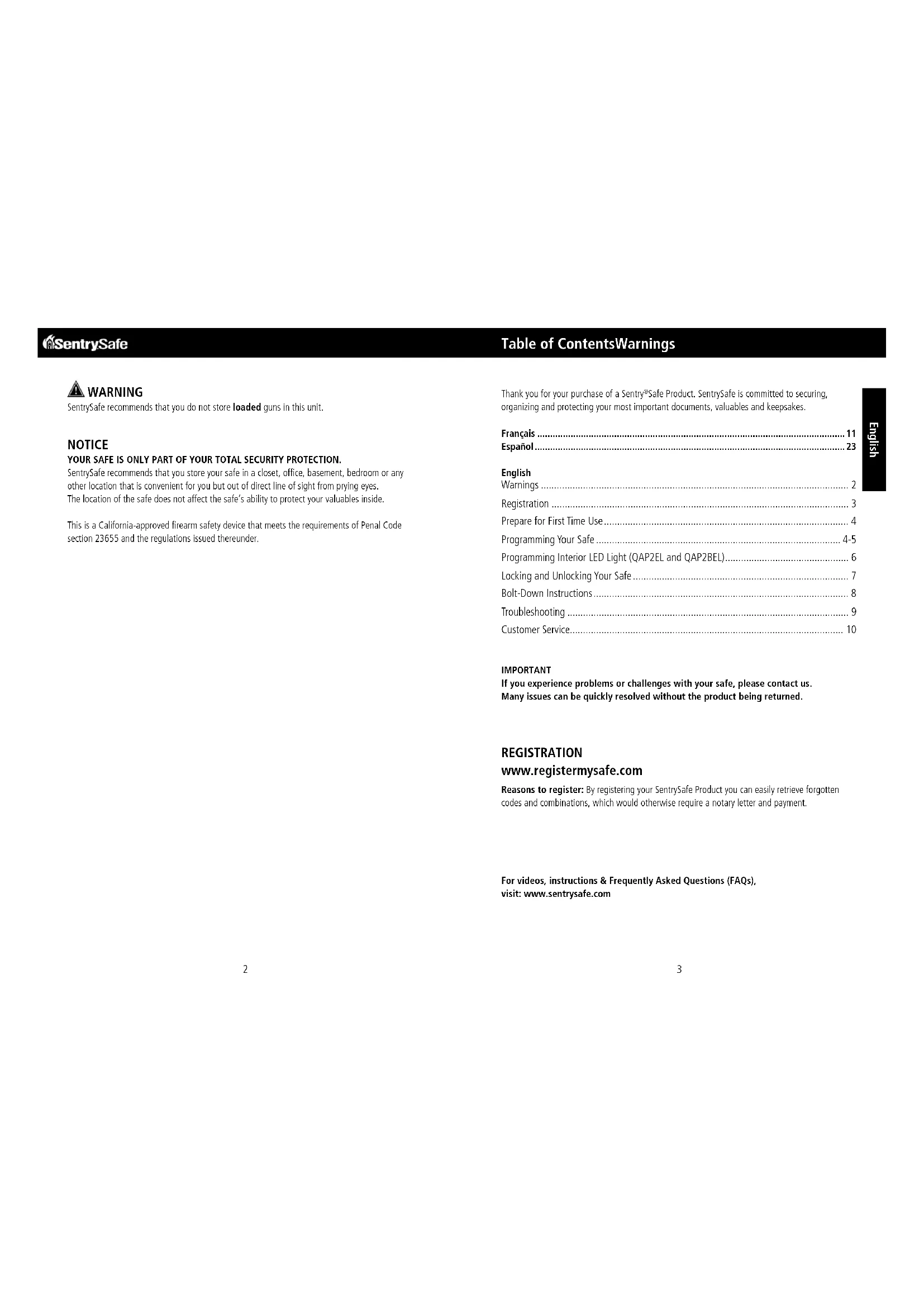 English Table of ContentsWarnings WARNING SentrySafe recommends that you do not store loaded guns in this unit. NOTICE YOUR SAFE IS ONLY PART OF YOUR TOTAL SECURITY PROTECTION. SentrySafe recommends that you store your safe in a closet, office, basement, bedroom or any other location that is convenient for you but out of direct line of sight from prying eyes. The location of the safe does not affect the safe’s ability to protect your valuables inside. This is a California-approved firearm safety device that meets the requirements of Penal Code
