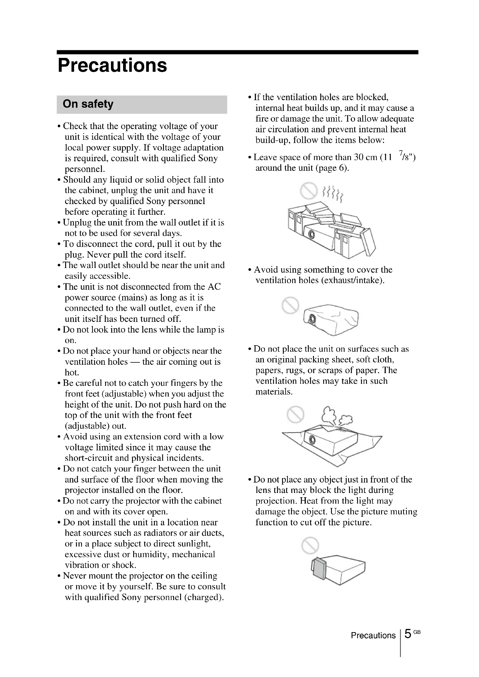 - Do not place any object just in front of the lens that may block the light during projection. Heat from the light may damage the object. Use the picture muting function to cut off the picture. On safetyGB 6 Precautions