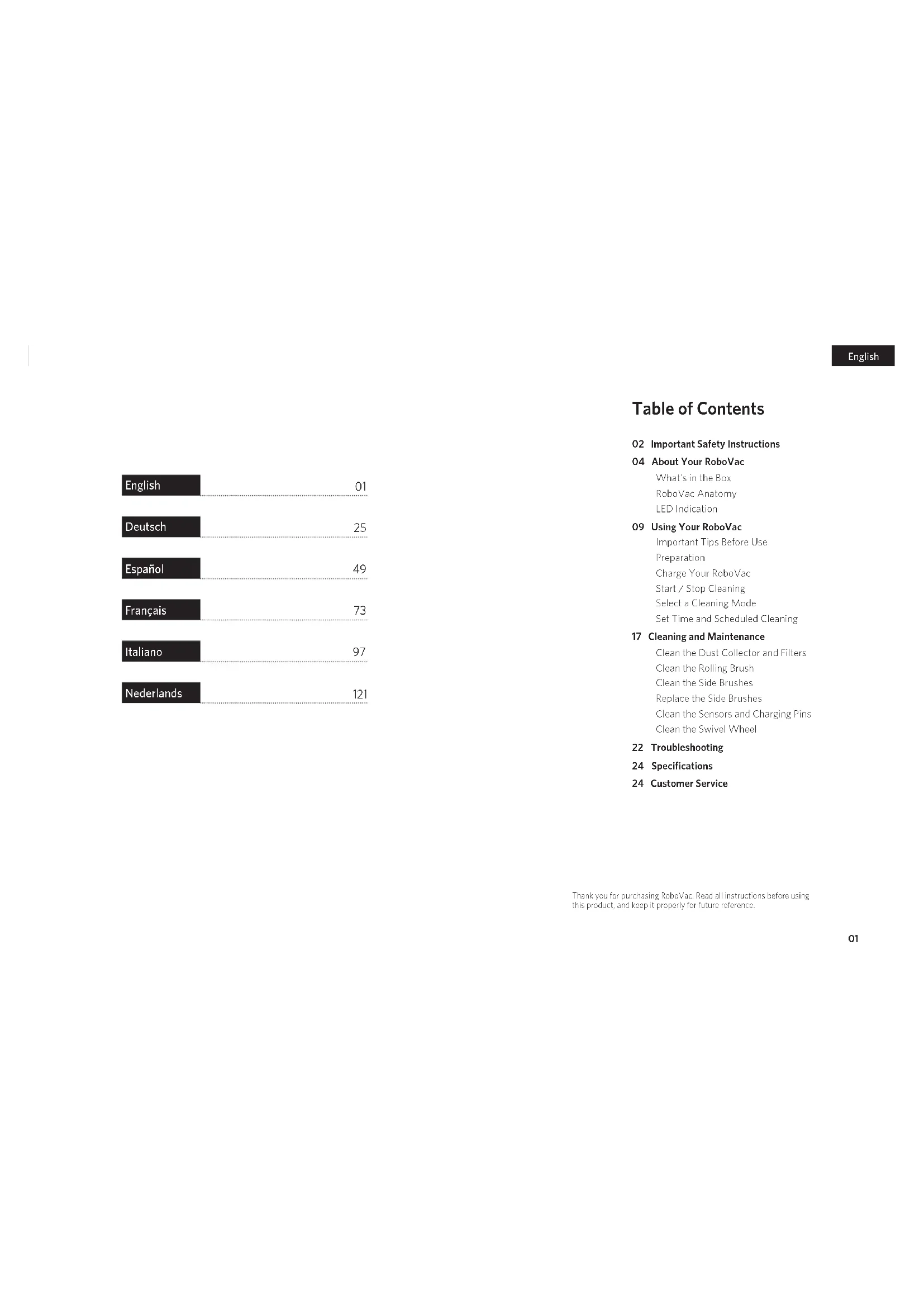 - This device has been designed to be used on floors without scratching them. We still recommend that you test this device on a small area of the room to be cleaned to ensure no scratches are made before cleaning the whole room. Notice This symbol on the device or its packaging indicates: Do not dispose of electrical appliances as unsorted municipal waste; use separate collection facilities. Contact your local authority for information regarding the collection systems available. If electrical appliances are disposed of in landfills or dumps, hazardous substances can leak into the groundwater and get into the food chain, damaging your health and well-being. When replacing old appliances with new ones, the retailer is legally obliged to take back your old appliance for disposal at least free of charge.04 05 English English About Your RoboVac What's in the Box RoboVac Power Adapter Additional High-Performance Filter Additional Foam Filter Owner’s Manual & Other Documents Cleaning Tool Side Brushes (x4) Charging Base Remote Control (AAA Battery x2) RoboVac Anatomy Top & Side Auto cleaning Start/Stop buttonBumperDust collector release buttonInfrared sensorDust collector Bottom Drop sensorsSwivel wheelSide brushesWheels Rolling brush Brush guardBattery compartmentCharging contact pinsDust collector Main power switch (On/Off)06 07 English English Dust Collector Pre-filter High-performance filter Foam filter Suction Inlet Dust collector Suction inlet Charging Base Status light Power cord storage compartment Power socket Charging contact pins Remote Control