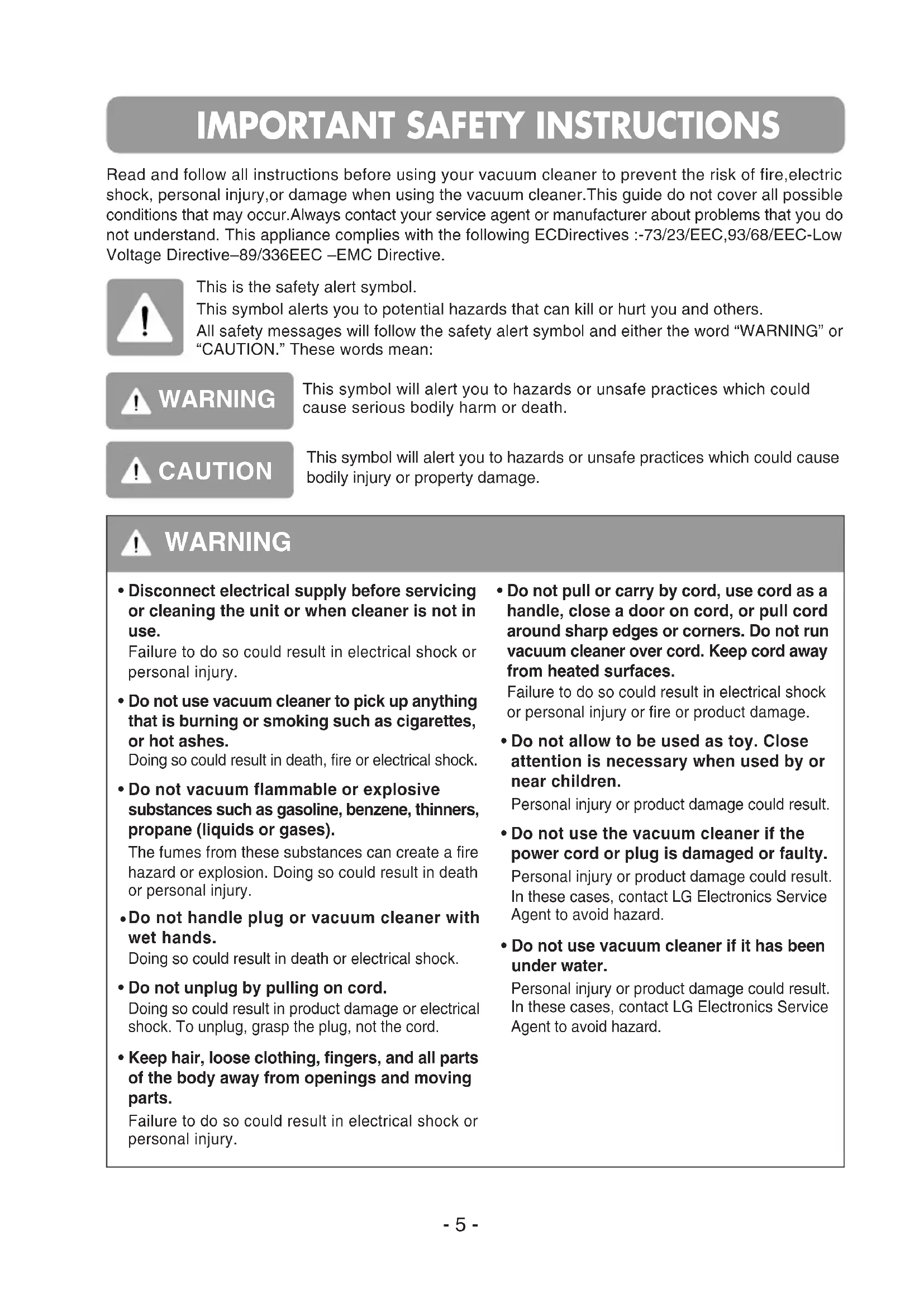 AppuyezIMPORTANT SAFETY INSTRUCTIONS Read and follow all instructions before using your vacuum cleaner to prevent the risk of fire,electric shock, personal injury,or damage when using the vacuum cleaner.This guide do not cover all possible conditions that may occur.Always contact your service agent or manufacturer about problems that you do not understand. This appliance complies with the following ECDirectives :-73/23/EEC,93/68/EEC-Low Voltage Directive–89/336EEC –EMC Directive.This is the safety alert symbol.This symbol alerts you to potential hazards that can kill or hurt you and others.All safety messages will follow the safety alert symbol and either the word “WARNING” or “CAUTION.” These words mean: WARNING This symbol will alert you to hazards or unsafe practices which could cause serious bodily harm or death. CAUTION This symbol will alert you to hazards or unsafe practices which could cause bodily injury or property damage. WARNING