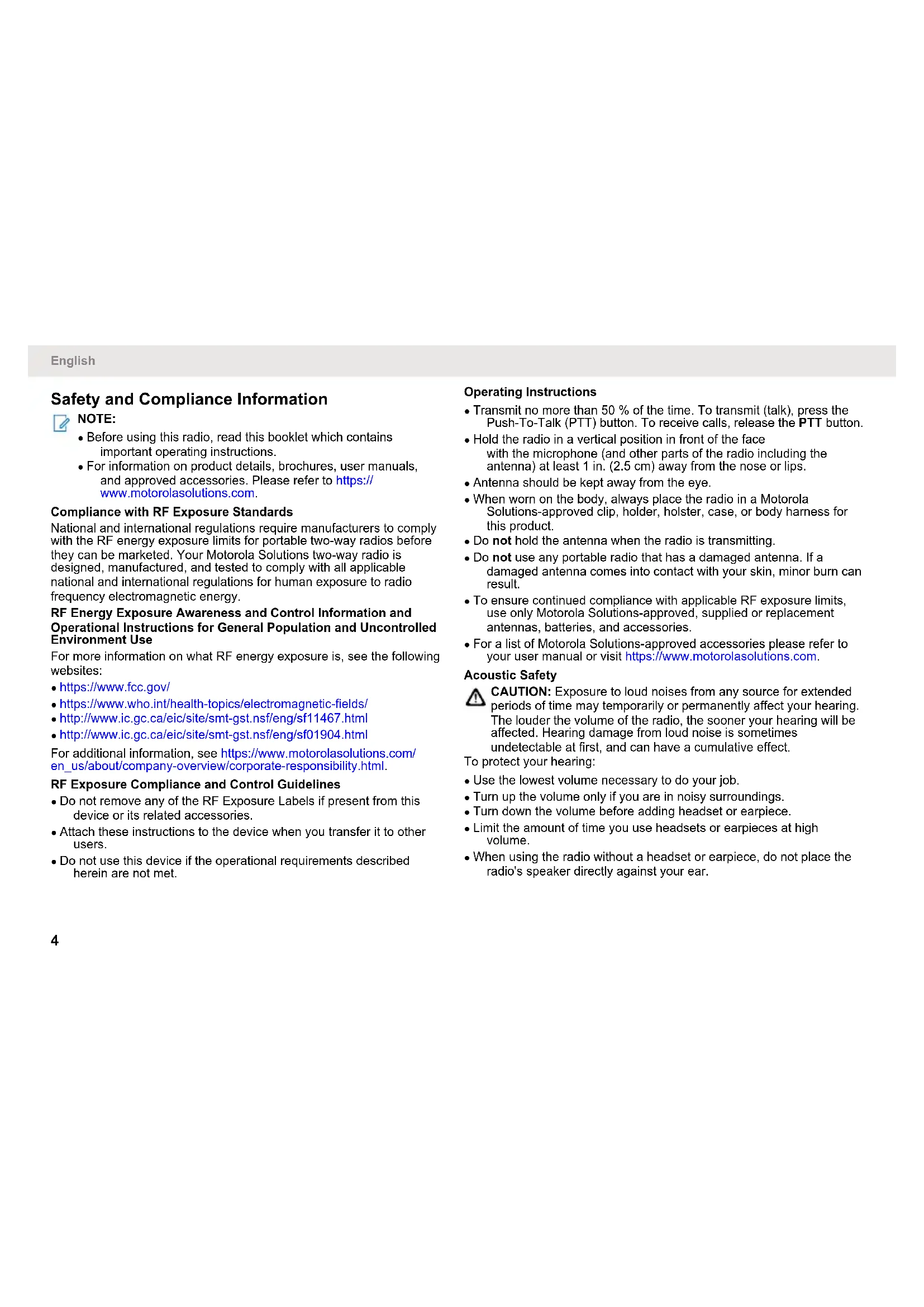 - Warranty English 3Safety and Compliance Information NOTE: ● Before using this radio, read this booklet which contains important operating instructions. ● For information on product details, brochures, user manuals, and approved accessories. Please refer to https:// www.motorolasolutions.com. Compliance with RF Exposure Standards National and international regulations require manufacturers to comply with the RF energy exposure limits for portable two-way radios before they can be marketed. Your Motorola Solutions two-way radio is designed, manufactured, and tested to comply with all applicable national and international regulations for human exposure to radio frequency electromagnetic energy. RF Energy Exposure Awareness and Control Information and Operational Instructions for General Population and Uncontrolled Environment Use For more information on what RF energy exposure is, see the following websites: ● https://www.fcc.gov/ ● https://www.who.int/health-topics/electromagnetic-fields/ ● http://www.ic.gc.ca/eic/site/smt-gst.nsf/eng/sf11467.html ● http://www.ic.gc.ca/eic/site/smt-gst.nsf/eng/sf01904.html For additional information, see https://www.motorolasolutions.com/ en_us/about/company-overview/corporate-responsibility.html. RF Exposure Compliance and Control Guidelines ● Do not remove any of the RF Exposure Labels if present from this device or its related accessories. ● Attach these instructions to the device when you transfer it to other users. ● Do not use this device if the operational requirements described herein are not met. Operating Instructions ● Transmit no more than 50 % of the time. To transmit (talk), press the Push-To-Talk (PTT) button. To receive calls, release the PTT button. ● Hold the radio in a vertical position in front of the face with the microphone (and other parts of the radio including the antenna) at least 1 in. (2.5 cm) away from the nose or lips. ● Antenna should be kept away from the eye. ● When worn on the body, always place the radio in a Motorola Solutions-approved clip, holder, holster, case, or body harness for this product. ● Do not hold the antenna when the radio is transmitting. ● Do not use any portable radio that has a damaged antenna. If a damaged antenna comes into contact with your skin, minor burn can result. ● To ensure continued compliance with applicable RF exposure limits, use only Motorola Solutions-approved, supplied or replacement antennas, batteries, and accessories. ● For a list of Motorola Solutions-approved accessories please refer to your user manual or visit https://www.motorolasolutions.com. Acoustic Safety CAUTION: Exposure to loud noises from any source for extended periods of time may temporarily or permanently affect your hearing. The louder the volume of the radio, the sooner your hearing will be affected. Hearing damage from loud noise is sometimes undetectable at first, and can have a cumulative effect. To protect your hearing: ● Use the lowest volume necessary to do your job. ● Turn up the volume only if you are in noisy surroundings. ● Turn down the volume before adding headset or earpiece. ● Limit the amount of time you use headsets or earpieces at high volume. ● When using the radio without a headset or earpiece, do not place the radio's speaker directly against your ear. English 4Medical Devices CAUTION: If you use a personal medical device, such as a pacemaker or hearing aid, consult the manufacturer of your device to determine if it is adequately shielded from RF energy. Your physician may be able to assist you in obtaining this information. Holsters Incorporating Magnets Motorola Solutions holsters incorporate strong, neodymium magnets. If you use a personal medical device, such as a pacemaker or hearing aid, consult the manufacturer of your device to determine if it can be used in close proximity to magnets. Your physician may be able to assist you in obtaining this information. Also be aware that magnets can damage other products, including cell phones, computers, hard drives, and other electronic devices, as well as credit cards and magnetic media. Keep the holster away from any mechanical device that could be affected by a magnetic field. Consult the manufacturer of your product to determine if your device or product can be used in close proximity to magnets. Operational Warnings The following explains the operational warnings: For Vehicle with Air Bags p. 21
