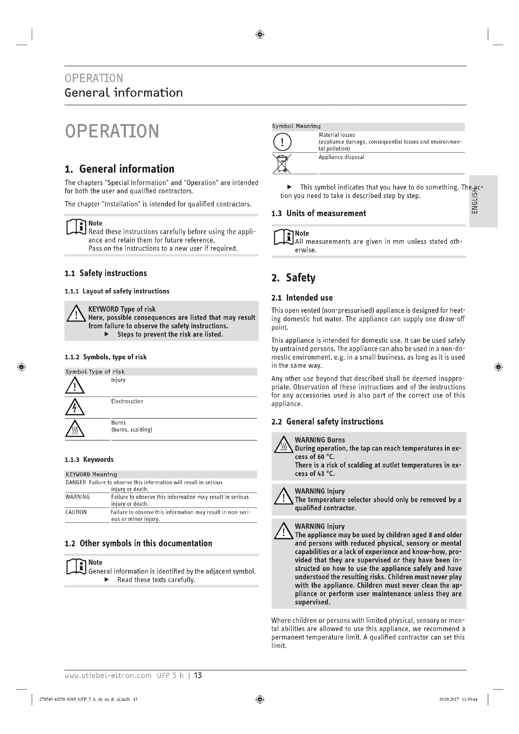 SPECIAL INFORMATION - The appliance may be used by children aged8 and older and persons with reduced physical, sensory or mental capabilities or a lack of ex- perience and know-how, provided that they are supervised or they have been instructed on how to use the appliance safely and have understood the resulting risks. Children must never play with the appliance. Children must never clean the ap- pliance or perform user maintenance unless they are supervised. - When permanently connected to the power sup- ply using a dedicated junction box, the appliance must be able to be isolated from the mains power supply by an isolator that disconnects all poles with at least 3mm contact separation. - The power cable may only be replaced (for exam- ple if damaged) by a qualified contractor author- ised by the manufacturer, using an original spare part. - Never connect the appliance via a time switch. - Secure the appliance as described in chapter "In- stallation/ Installation". - During heating, expansion water drips from the tap outlet. - The appliance must only be installed with an open (non-pressurised) tap. - Never subject the appliance to water pressure. - The tap outlet has a vent function. Scale build-up can block the outlet and subject the appliance to pressure. - Never seal the tap outlet. - Only use special aerators for non-pressurised water heaters. - Never extend the tap outlet with a hose. - Drain the appliance as described in chapter "In- stallation/ Maintenance/ Draining the appliance". 278549-40256-9263_UFP_5_h_de_en_fr_nl.indb 12 19.09.2017 11:30:41OPERATION General information www.stiebel-eltron.com UFP 5 h | 13 ENGLISH OPERATION