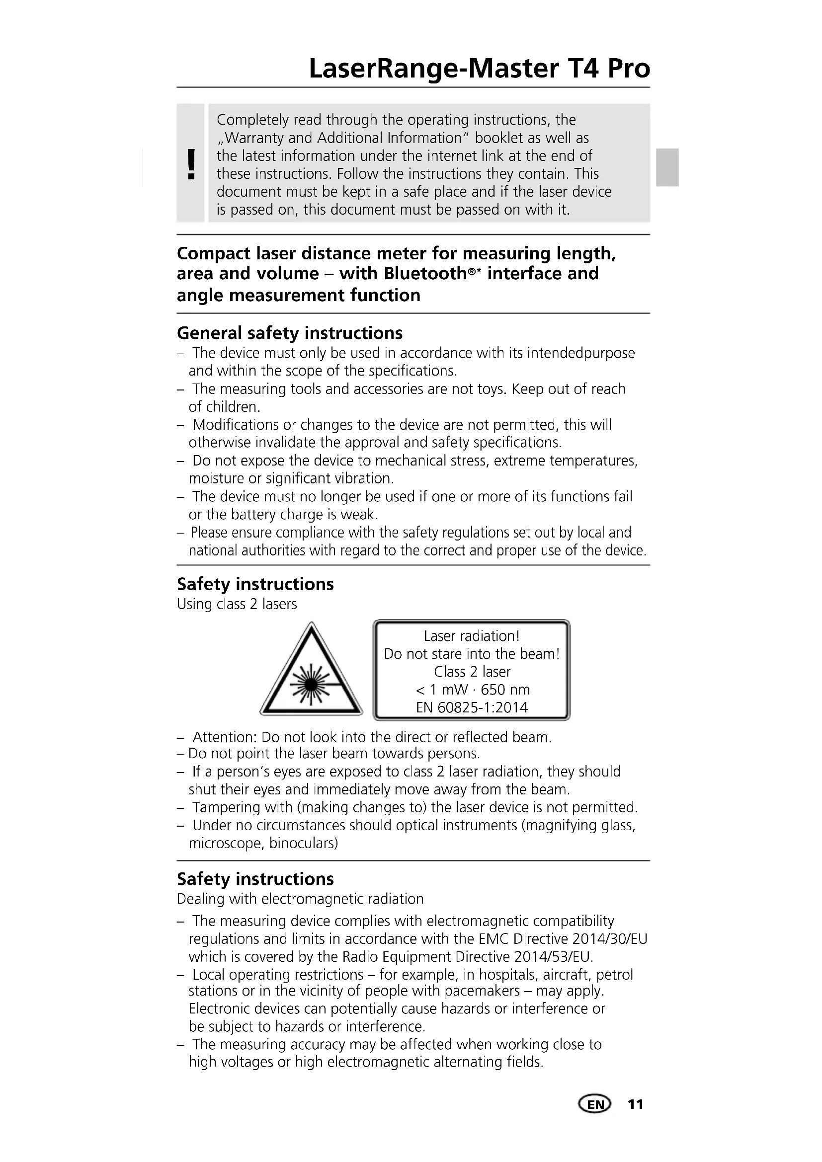 - The Bluetooth word mark and the logo are registered trademarks of Bluetooth SIG Inc. Safety instructions Dealing with RF radiation – The measuring device is equipped with a wireless interface. – The measuring device complies with electromagnetic compatibility and wireless radiation regulations and limits in accordance with the RED 2014/53/EU. – Umarex GmbH & Co. KG hereby declares that the LaserRange-Master T4 Pro radio equipment complies with the essential requirements and other provisions of the European Radio Equipment Directive 2014/53/EU (RED). The EU Declaration of Conformity can be found in its entirety at the following address: http://laserliner.com/info?an=lrmt4LaserRange-Master T4 Pro