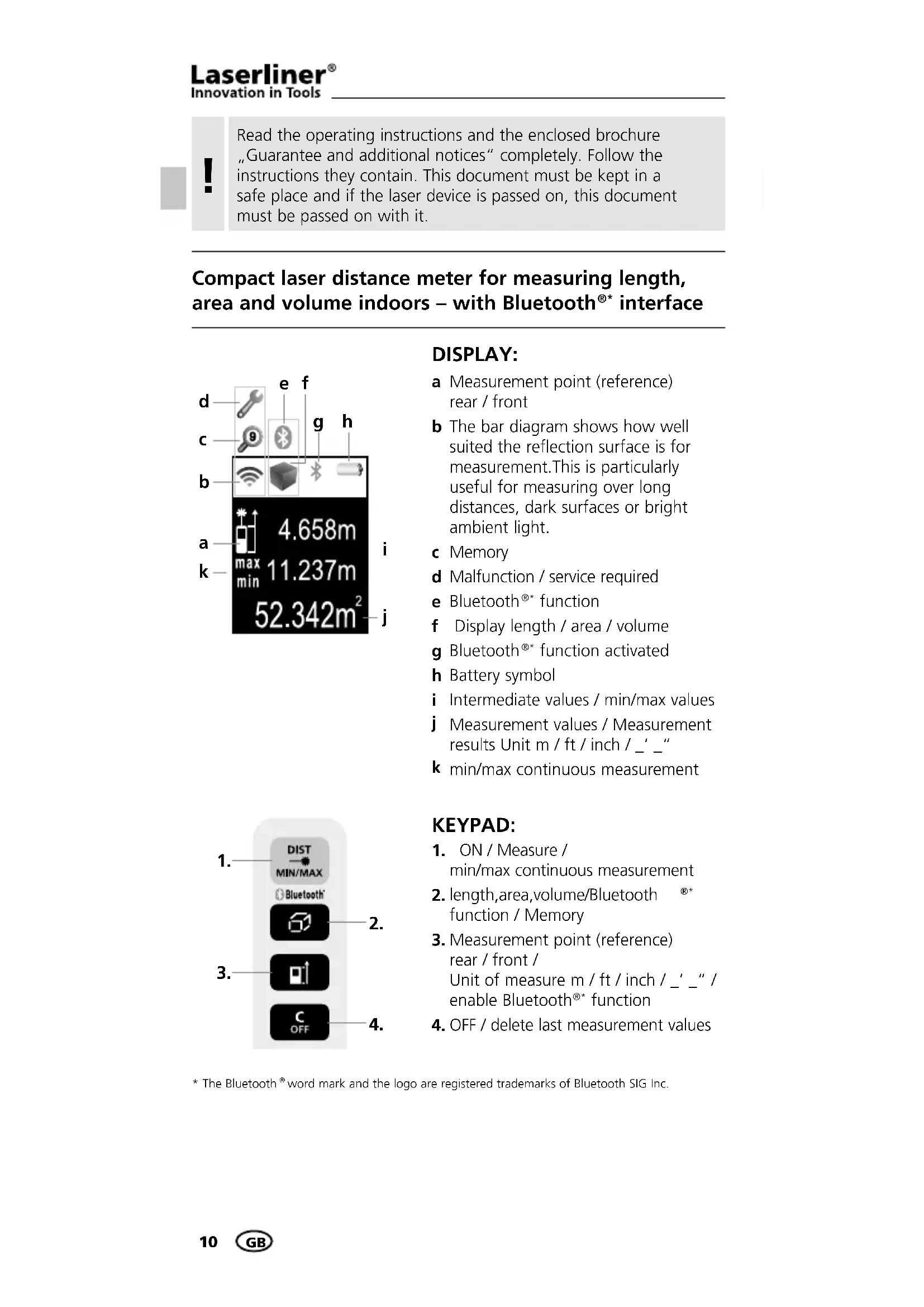 Read the operating instructions and the enclosed brochure „Guarantee and additional notices“ completely. Follow the instructions they contain. This document must be kept in a safe place and if the laser device is passed on, this document must be passed on with it.
