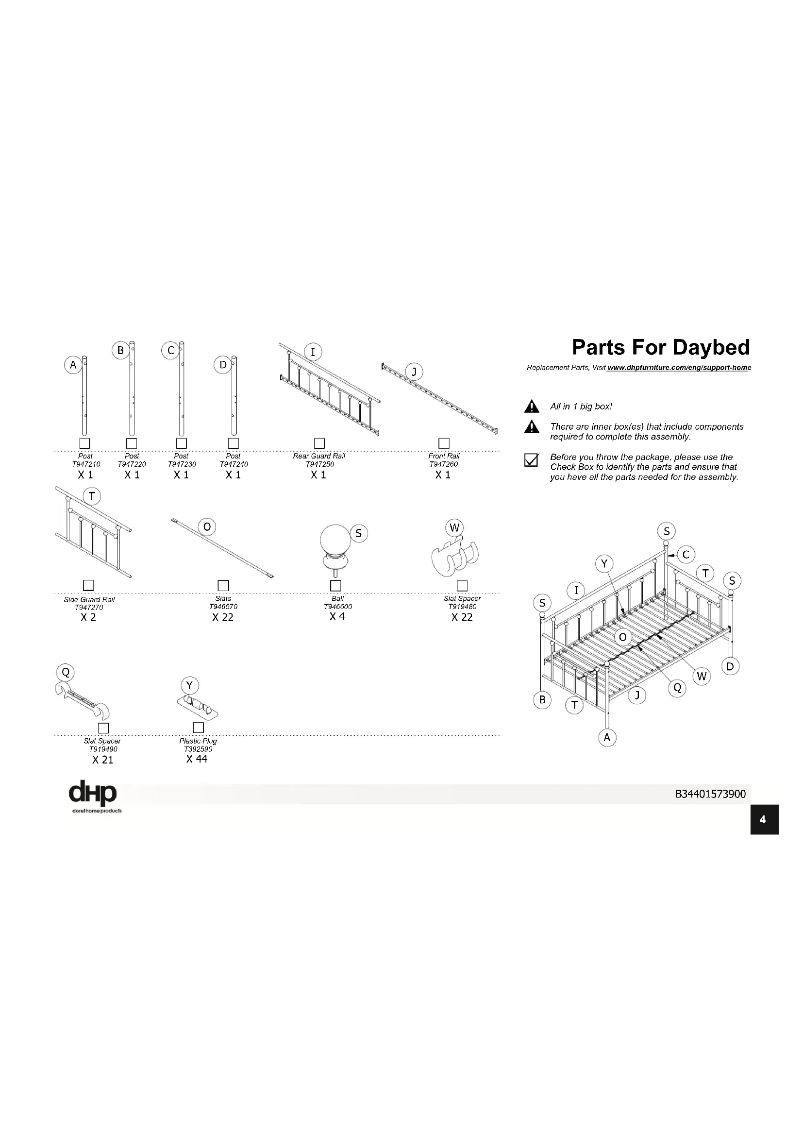 Before you throw the package, please use the Check Box to identify the parts and ensure that you have all the parts needed for the assembly. There are inner box(es) that include components required to complete this assembly. Replacement Parts, Visit www.dhpfurniture.com/eng/support-home