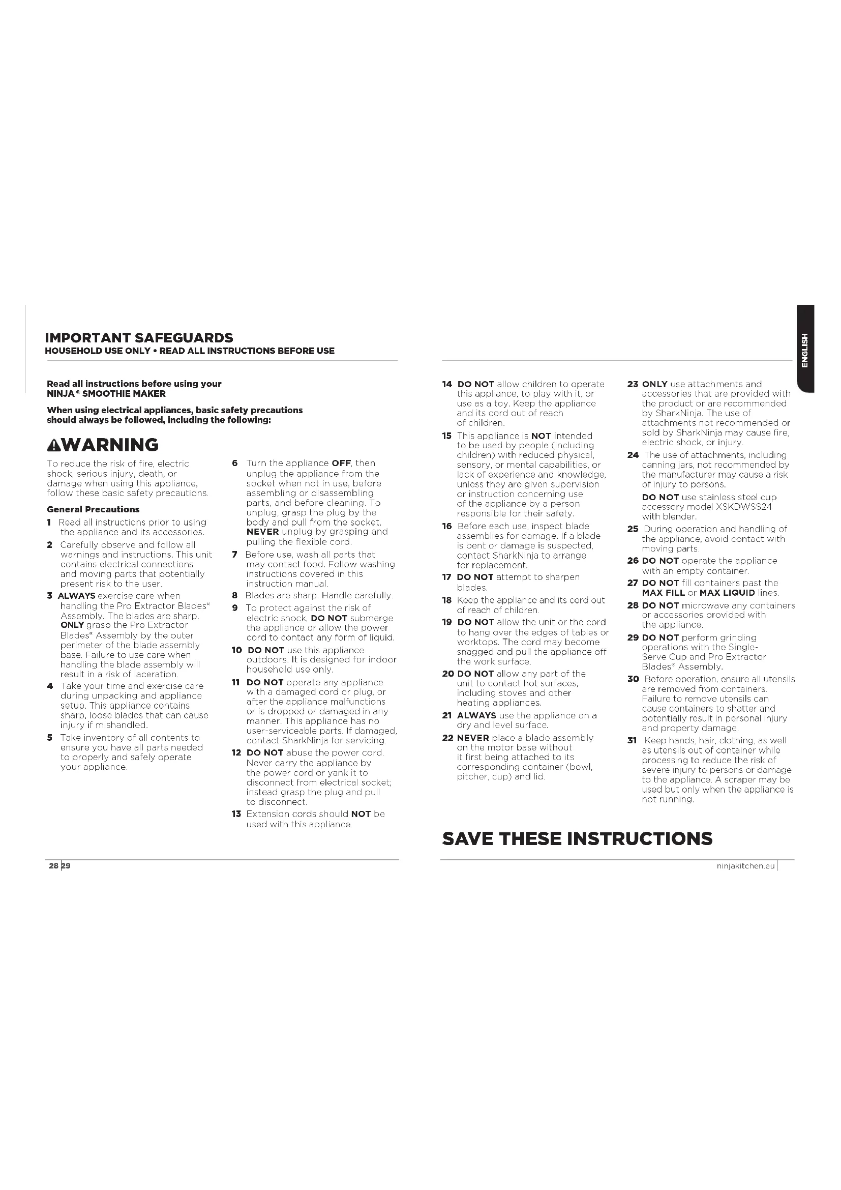 SMOOTHIE MAKER When using electrical appliances, basic safety precautions should always be followed, including the following: WARNING To reduce the risk of fire, electric shock, serious injury, death, or damage when using this appliance, follow these basic safety precautions. General Precautions 1 Read all instructions prior to using the appliance and its accessories. 2 Carefully observe and follow all warnings and instructions. This unit contains electrical connections and moving parts that potentially present risk to the user. 3 ALWAYS exercise care when handling the Pro Extractor Blades® Assembly. The blades are sharp. ONLY grasp the Pro Extractor Blades® Assembly by the outer perimeter of the blade assembly base. Failure to use care when handling the blade assembly will result in a risk of laceration. 4 Take your time and exercise care during unpacking and appliance setup. This appliance contains sharp, loose blades that can cause injury if mishandled. 5 Take inventory of all contents to ensure you have all parts needed to properly and safely operate your appliance. 6 Turn the appliance OFF, then unplug the appliance from the socket when not in use, before assembling or disassembling parts, and before cleaning. To unplug, grasp the plug by the body and pull from the socket. NEVER unplug by grasping and pulling the flexible cord. 7 Before use, wash all parts that may contact food. Follow washing instructions covered in this instructionmanual. 8 Blades are sharp. Handle carefully. 9 To protect against the risk of electric shock, DO NOT submerge the appliance or allow the power cord to contact any form of liquid. 10 DO NOT use this appliance outdoors. It is designed for indoor household use only. 11 DO NOT operate any appliance with a damaged cord or plug, or after the appliance malfunctions or is dropped or damaged in any manner. This appliance has no user-serviceable parts. If damaged, contact SharkNinja for servicing. 12 DO NOT abuse the power cord. Never carry the appliance by the power cord or yank it to disconnect from electrical socket; instead grasp the plug and pull to disconnect. 13 Extension cords should NOT be used with this appliance. 14 DO NOT allow children to operate this appliance, to play with it, or use as a toy. Keep the appliance and its cord out of reach of children. 15 This appliance is NOT intended to be used by people (including children) with reduced physical, sensory, or mental capabilities, or lack of experience and knowledge, unless they are given supervision or instruction concerning use of the appliance by a person responsible for their safety. 16 Before each use, inspect blade assemblies for damage. If a blade is bent or damage is suspected, contact SharkNinja to arrange for replacement. 17 DO NOT attempt to sharpen blades. 18 Keep the appliance and its cord out of reach of children. 19 DO NOT allow the unit or the cord to hang over the edges of tables or worktops. The cord may become snagged and pull the appliance o the work surface. 20 DO NOT allow any part of the unit to contact hot surfaces, including stoves and other heating appliances. 21 ALWAYS use the appliance on a dry and level surface. 22 NEVER place a blade assembly on the motor base without it first being attached to its corresponding container (bowl, pitcher, cup) and lid. 23 ONLY use attachments and accessories that are provided with the product or are recommended by SharkNinja. The use of attachments not recommended or sold by SharkNinja may cause fire, electric shock, or injury. 24 The use of attachments, including canning jars, not recommended by the manufacturer may cause a risk of injury to persons. DO NOT use stainless steel cup accessory model XSKDWSS24 with blender. 25 During operation and handling of the appliance, avoid contact with moving parts. 26 DO NOT operate the appliance with an empty container. 27 DO NOT fill containers past the MAX FILL or MAX LIQUID lines. 28 DO NOT microwave any containers or accessories provided with the appliance. 29 DO NOT perform grinding operations with the Single- Serve Cup and Pro Extractor Blades® Assembly. 30 Before operation, ensure all utensils are removed from containers. Failure to remove utensils can cause containers to shatter and potentially result in personal injury and property damage. 31 Keep hands, hair, clothing, as well as utensils out of container while processing to reduce the risk of severe injury to persons or damage to the appliance. A scraper may be used but only when the appliance is not running.