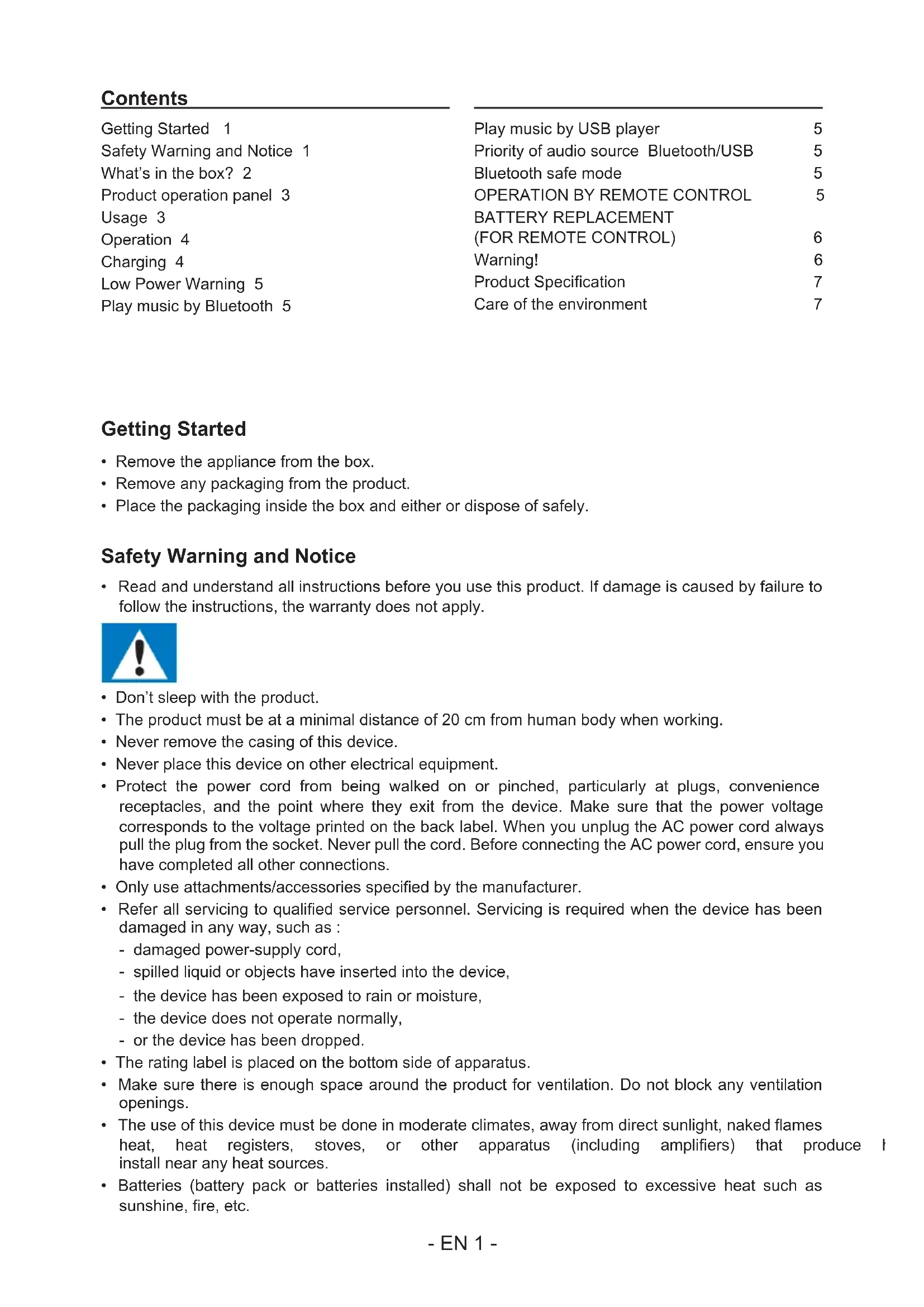 - %DWWHULHV EDWWHU\ SDFN RU EDWWHULHV LQVWDOOHG VKDOO QRW EH H[SRVHG WR H[FHVVLYH KHDW VXFK DV VXQVKLQH¿UHHWF Getting Started 1 Safety Warning and Notice 1 What’s in the box? 2 Product operation panel 3 Usage 3 Operation 4 Charging 4 Low Power Warning 5 Play music by Bluetooth 5 Play music by USB player 5 Priority of audio source: Bluetooth/USB 5 Bluetooth safe mode 5