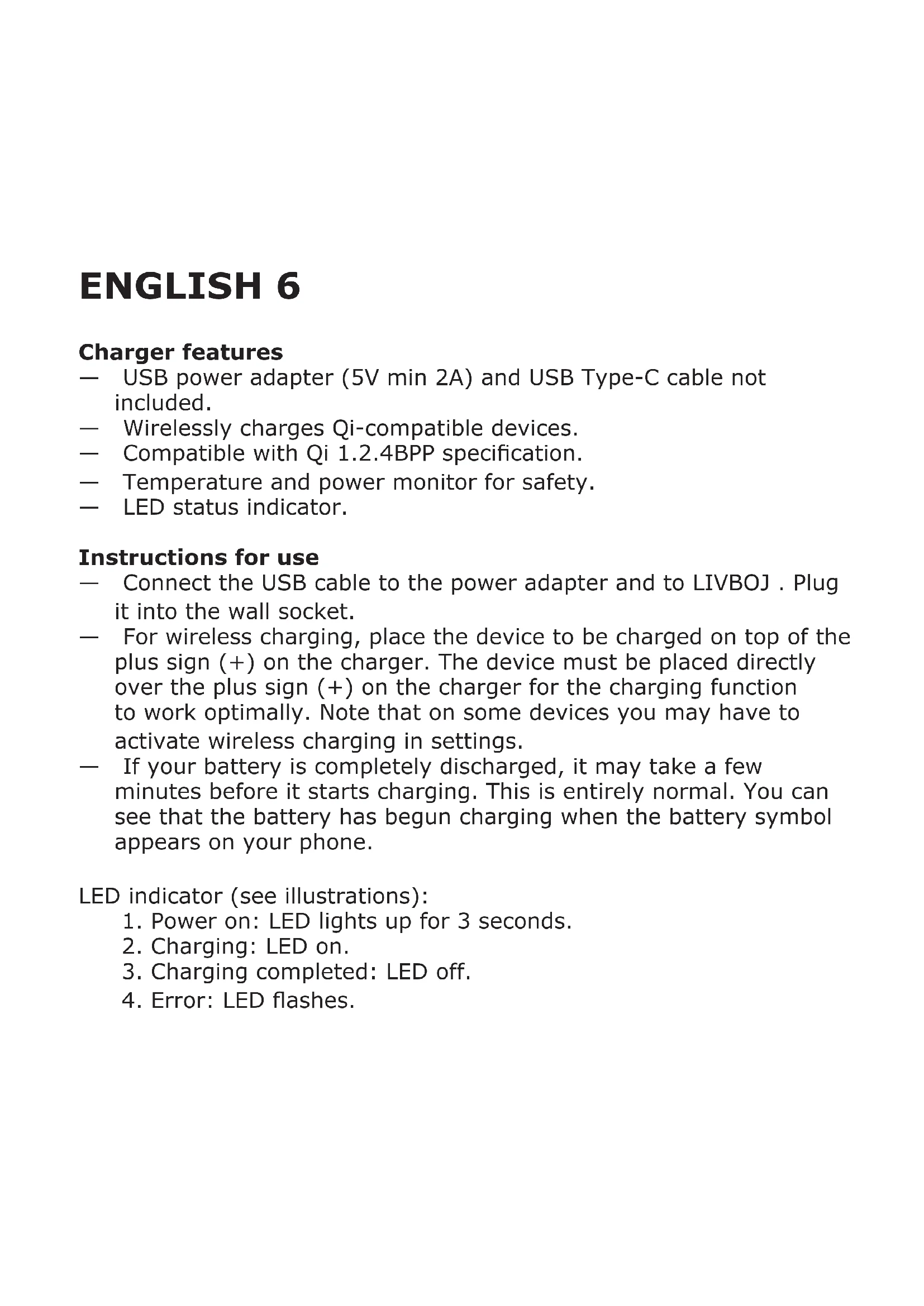 62ENGLISH 6 Charger features — USB power adapter (5V min 2A) and USB Type-C cable not included. — Wirelessly charges Qi-compatible devices. — Compatible with Qi 1.2.4BPP specication. — Temperature and power monitor for safety. — LED status indicator. Instructions for use — Connect the USB cable to the power adapter and to LIVBOJ . Plug it into the wall socket. — For wireless charging, place the device to be charged on top of the plus sign (+) on the charger. The device must be placed directly over the plus sign (+) on the charger for the charging function to work optimally. Note that on some devices you may have to activate wireless charging in settings. — If your battery is completely discharged, it may take a few minutes before it starts charging. This is entirely normal. You can see that the battery has begun charging when the battery symbol appears on your phone. LED indicator (see illustrations):