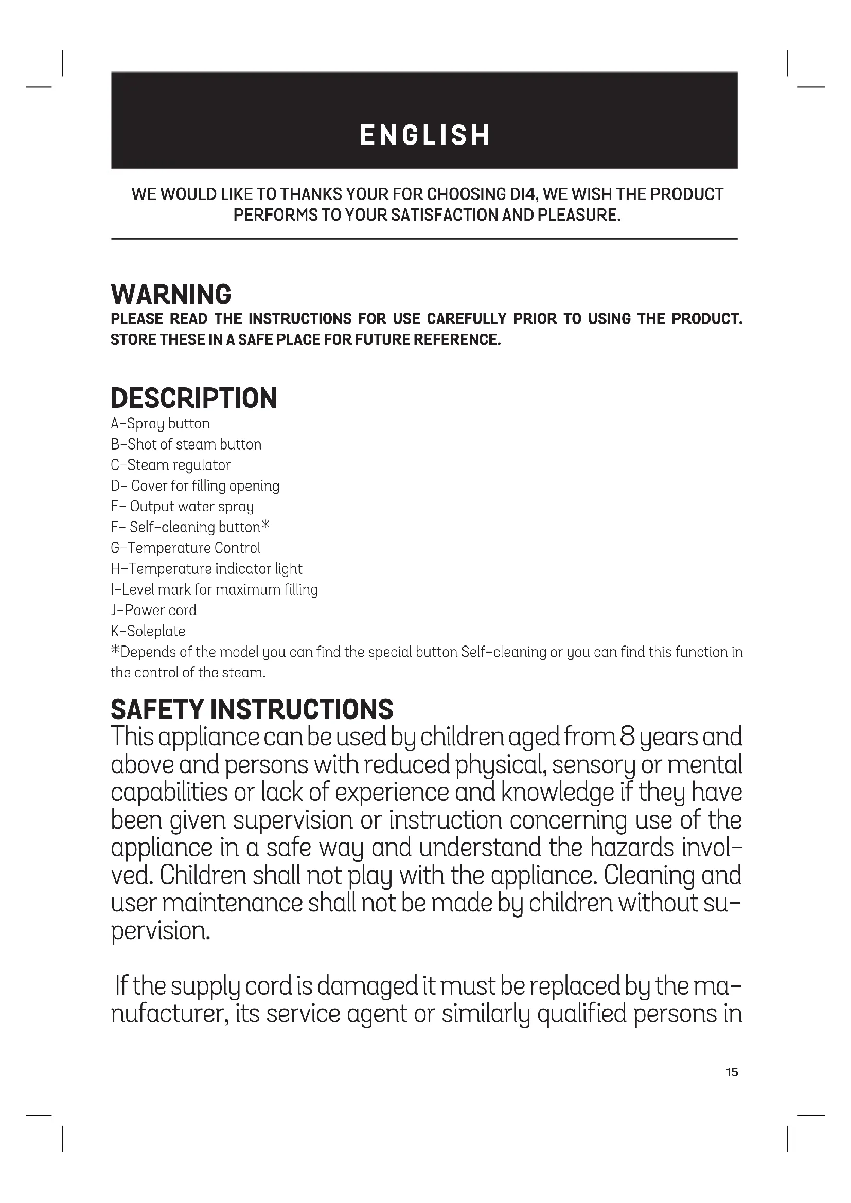Este produto está em conformidade com a Diretiva Europeia 2012/19/UE quanto a dispo- sitivos elétricos e eletrónicos, conhecida como REEE (Resíduos de Equipamentos Elétricos e Eletrónicos), que disponibiliza o enquadramento legal dentro da União Europeia para a eliminação e reutilização de resíduos eletrónicos e elétricos. Não eliminar este produto no caixote do lixo, dirigir-se antes ao centro de recolha de resíduos elétricos e eletrónicos da área de residência. Esperamos que fique satisfeito com este produto.15 WE WOULD LIKE TO THANKS YOUR FOR CHOOSING DI4, WE WISH THE PRODUCT PERFORMS TO YOUR SATISFACTION AND PLEASURE. WARNING PLEASE READ THE INSTRUCTIONS FOR USE CAREFULLY PRIOR TO USING THE PRODUCT. STORE THESE IN A SAFE PLACE FOR FUTURE REFERENCE. DESCRIPTION A-Spray button B-Shot of steam button C-Steam regulator D- Cover for filling opening E- Output water spray F- Self-cleaning button* G-Temperature Control H-Temperature indicator light I-Level mark for maximum filling J-Power cord K-Soleplate *Depends of the model you can find the special button Self-cleaning or you can find this function in the control of the steam. SAFETY INSTRUCTIONS This appliance can be used by children aged from 8 years and above and persons with reduced physical, sensory or mental capabilities or lack of experience and knowledge if they have been given supervision or instruction concerning use of the appliance in a safe way and understand the hazards invol- ved. Children shall not play with the appliance. Cleaning and user maintenance shall not be made by children without su- pervision. If the supply cord is damaged it must be replaced by the ma- nufacturer, its service agent or similarly qualified persons in ENGLISH16 order to avoid a hazard. The iron must not be left unattended while it is connected to the supply mains. The plug must be removed from the socket-outlet before the water reservoir is filled with water. The iron must be used and rested on a flat, stable surface When placing the iron on its stand, ensure that the surface on which the stand is placed is stable. The iron is not to be used if it has been dropped, if there are visible signs of damage or if it is leaking. Keep the iron and its cord out of reach of children less than 8 years of age when it is energized or cooling down. CAUTION Hot surfaces. Surfaces are liable to get hot during use. IMPORTANT WARNINGS This appliance is designed for home use and should never be used for commercial or industrial use under any circumstances. Any incorrect use or improper handling of the product shall render the warranty null and void. Prior to plugging in the product, check that your mains voltage is the same as the one indicated on the product label. If you use one adaptor make sure it can reach 16 A and is provided with earth socket The mains connection cable must not be tangled or wrapped around the product during use.17 Do not use the device, or connect and disconnect to t supply mains with the hands and / or feet wet. Do not pull on the connection cord in order to unplug it or use it as a handle Do not direct steam at people and animals. Do not place the appliance under the tap to fill the water tank, or immerse it in water or other liquids. Unplug the product immediately from the mains in the event of any breakdown or damage and contact an official technical support service. In order to prevent any risk of danger, do not open the device. Only qualified technical personnel from the brand´s Official technical support service may carry out repairs or procedures on the device. Only an official technical support service centre may carry out repairs on this product. Proceed according to maintenance and cleaning section of this manual for cleaning B&B TRENDS SL. disclaims all liability for damages that may occur to people, animals or objects, for the non-observance of these warnings.