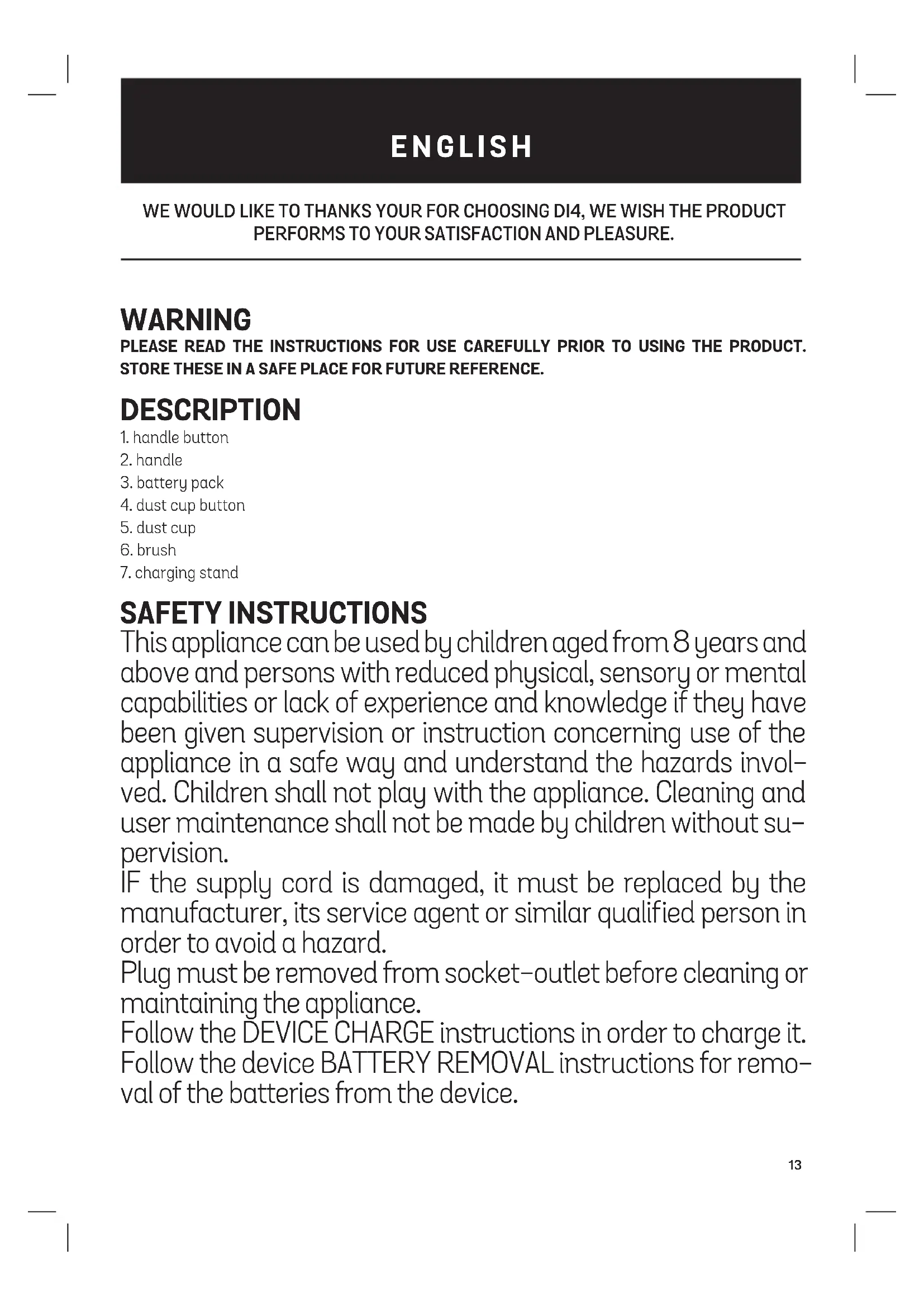 SAFETY INSTRUCTIONS This appliance can be used by children aged from 8 years and above and persons with reduced physical, sensory or mental capabilities or lack of experience and knowledge if they have been given supervision or instruction concerning use of the appliance in a safe way and understand the hazards invol- ved. Children shall not play with the appliance. Cleaning and user maintenance shall not be made by children without su- pervision. IF the supply cord is damaged, it must be replaced by the manufacturer, its service agent or similar qualified person in order to avoid a hazard. Plug must be removed from socket-outlet before cleaning or maintaining the appliance. Follow the DEVICE CHARGE instructions in order to charge it. Follow the device BATTERY REMOVAL instructions for remo- val of the batteries from the device. ENGLISH14 IMPORTANT WARNINGS Prior to plugging in the product, check that your mains voltage is the same as the one indicated on the product label. The mains connection cable must not be tangled or wrapped around the product during use. Do not pull on the connection cord in order to unplug it. Do not use, connect or disconnect the device to the mains with your hands or feet wet. Proceed according to the conservation and cleaning section of this manual for cleaning. Unplug the product immediately from the mains in the event of any breakdown or damage and con- tact an authorised Technical support service. In order to prevent any risk of danger, do not open the device. Only qualified technical personnel from the brand´s Official Technical support service may carry out repairs or procedures on the device. Any incorrect use or improper handling of the product shall render the warranty null and void. Only an authorised technical support service centre may carry out repairs on this product. This appliance is designed exclusively for domestic use, in no case should be a commercial or indus- trial use. In case of misuse or tampering with the product, it will be out of warranty. Do not use the appliance to vacuum liquids (water, etc), sharp objects (pins, pins, nails, glass, etc), incandescent objects (matches, cigarettes) Never use the turbobrush to: Polish floors, suck (Liquids, wet or damp dust, hot ash, burning ob- jects, such as cigarettes, matches, sharp and hard items, such us: razors, pins, thumbtacks, pieces of glass, etc), flour, cement, plaster, printer or photocopier toner, etc. B&B TRENDS SL. disclaims all liability for damages that may occur to people, animals or objects, for the non-observance of these warnings.