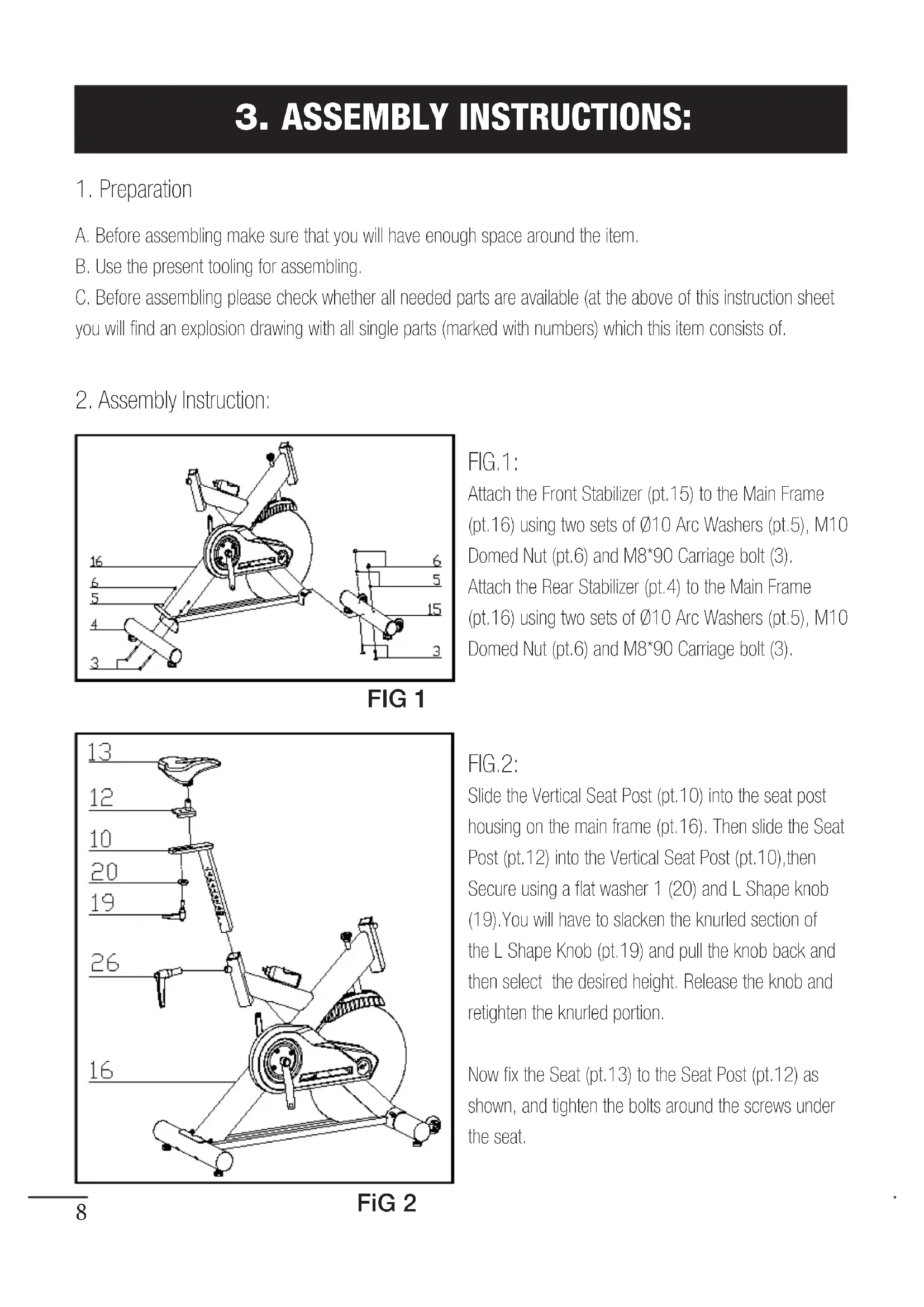 A. Before assembling make sure that you will have enough space around the item. B. Use the present tooling for assembling. C. Before assembling please check whether all needed parts are available (at the above of this instruction sheet you will find an explosion drawing with all single parts (marked with numbers) which this item consists of. FIG 1 FiG 2 FIG.1: Attach the Front Stabilizer (pt.15) to the Main Frame (pt.16) using two sets of Ø10 Arc Washers (pt.5), M10 Domed Nut (pt.6) and M8*90 Carriage bolt (3). Attach the Rear Stabilizer (pt.4) to the Main Frame (pt.16) using two sets of Ø10 Arc Washers (pt.5), M10 Domed Nut (pt.6) and M8*90 Carriage bolt (3). FIG.2: Slide the Vertical Seat Post (pt.10) into the seat post housing on the main frame (pt.16). Then slide the Seat Post (pt.12) into the Vertical Seat Post (pt.10),then Secure using a flat washer 1 (20) and L Shape knob (19).You will have to slacken the knurled section of the L Shape Knob (pt.19) and pull the knob back and then select the desired height. Release the knob and retighten the knurled portion. Now fix the Seat (pt.13) to the Seat Post (pt.12) as shown, and tighten the bolts around the screws under the seat.